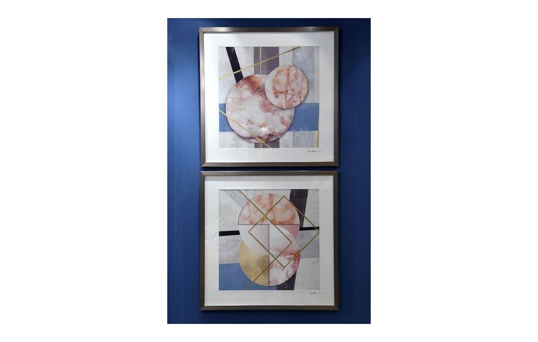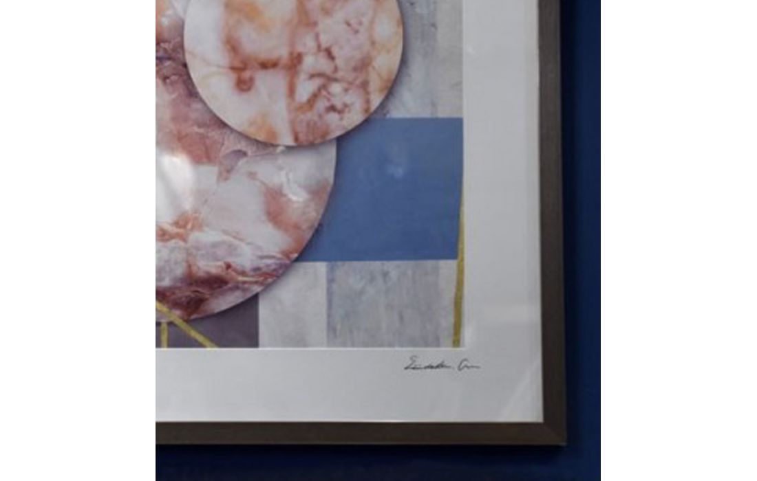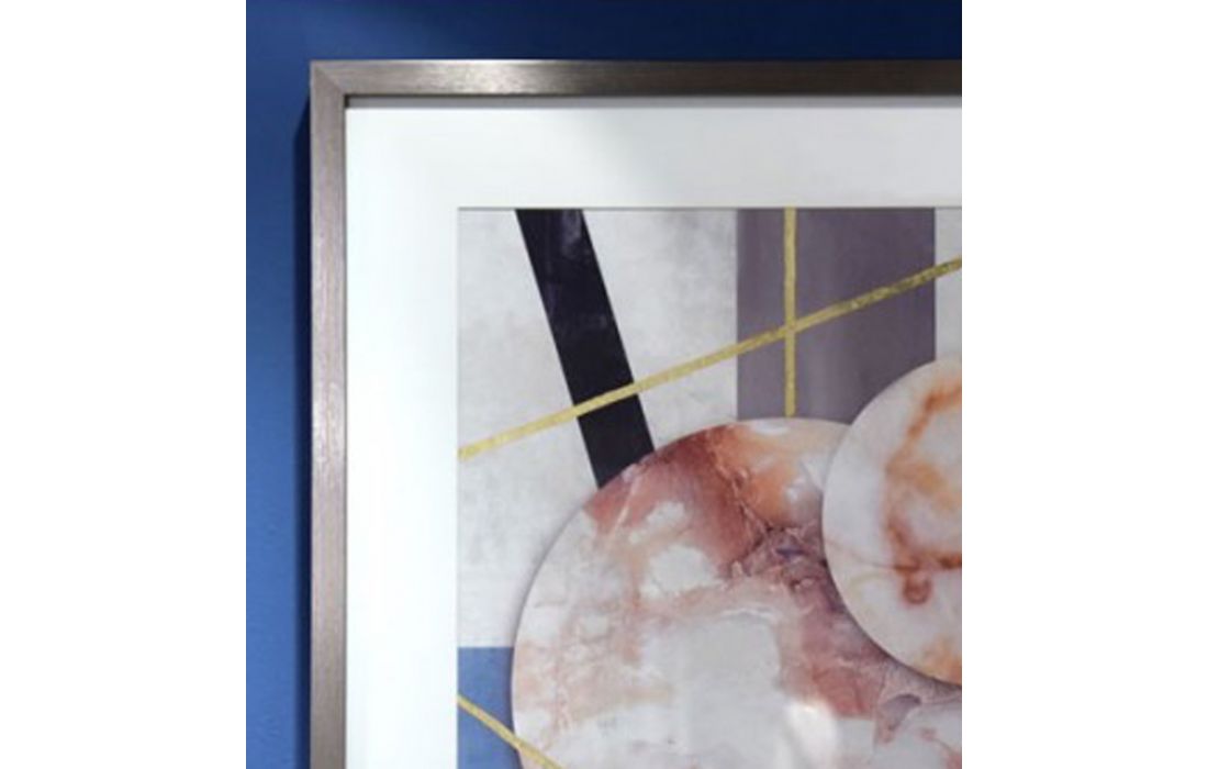 Frame with geometric painting in soft colors and with subtle applications of gold leaf, framed with glass and silver tone frame.