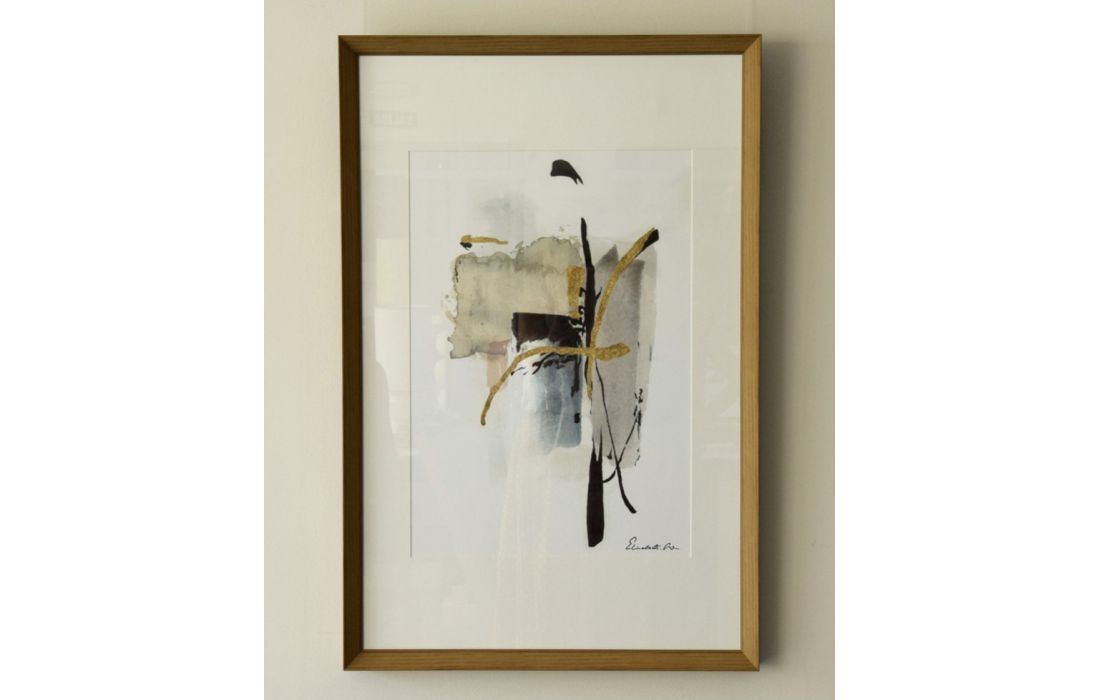 Hand painted abstract painting on paper with a subtle application of gold powder, with glass and wooden frame in natural color.