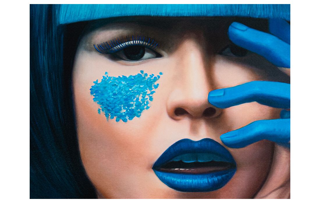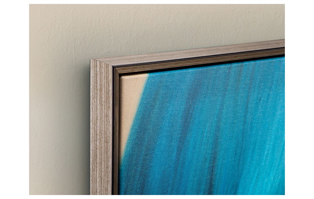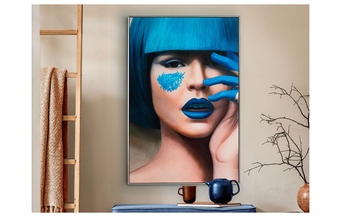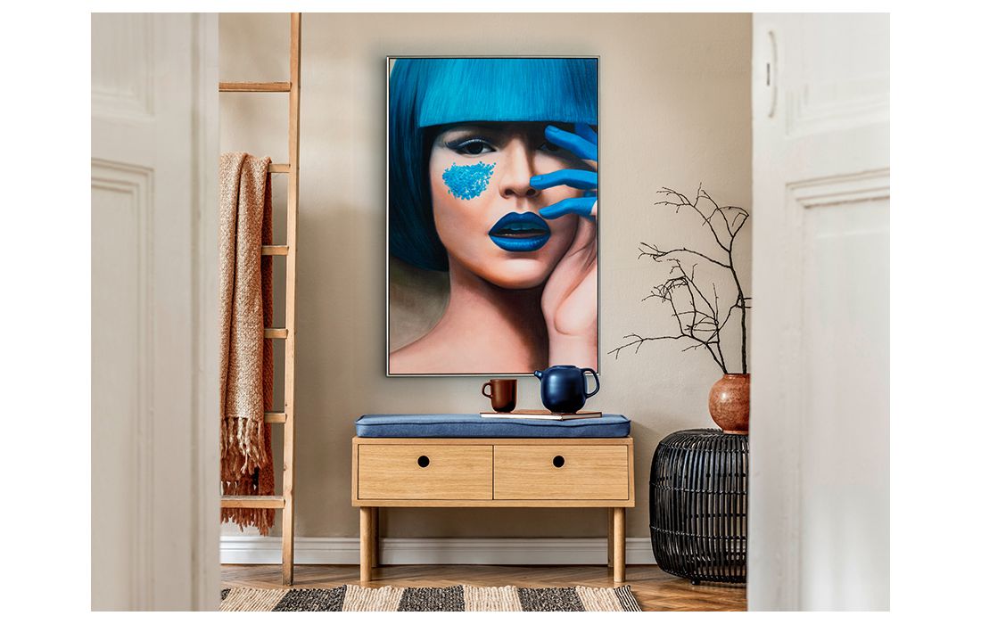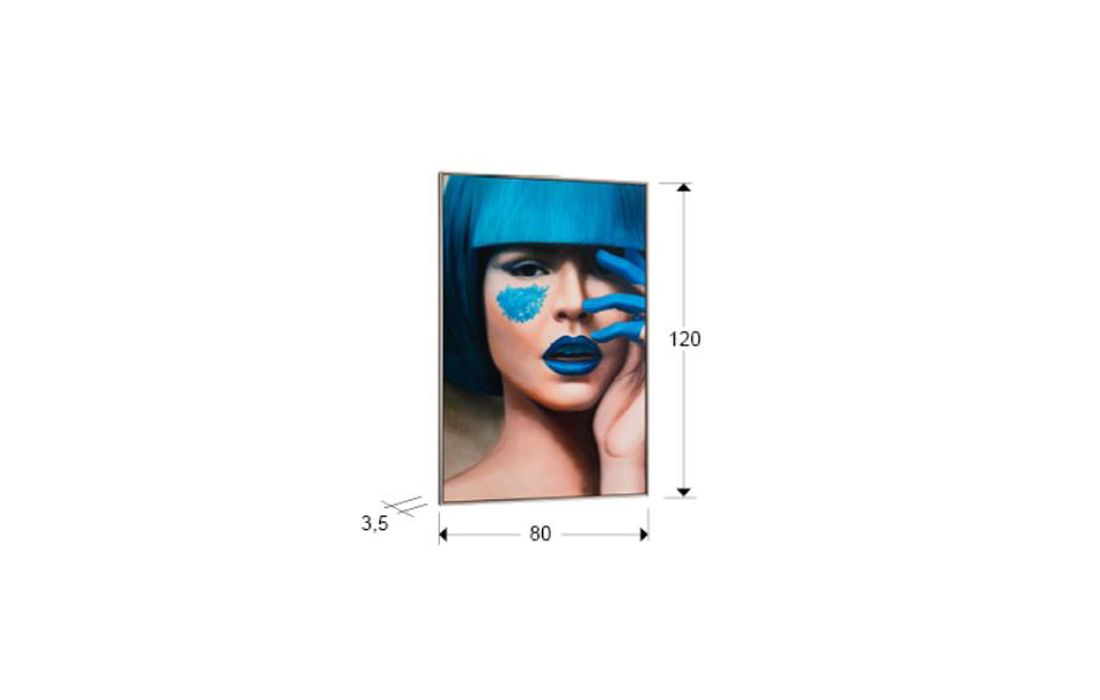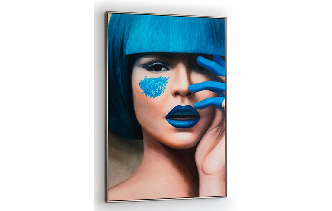 Printed screen of female face, MDF frame with satin black and silver finish.