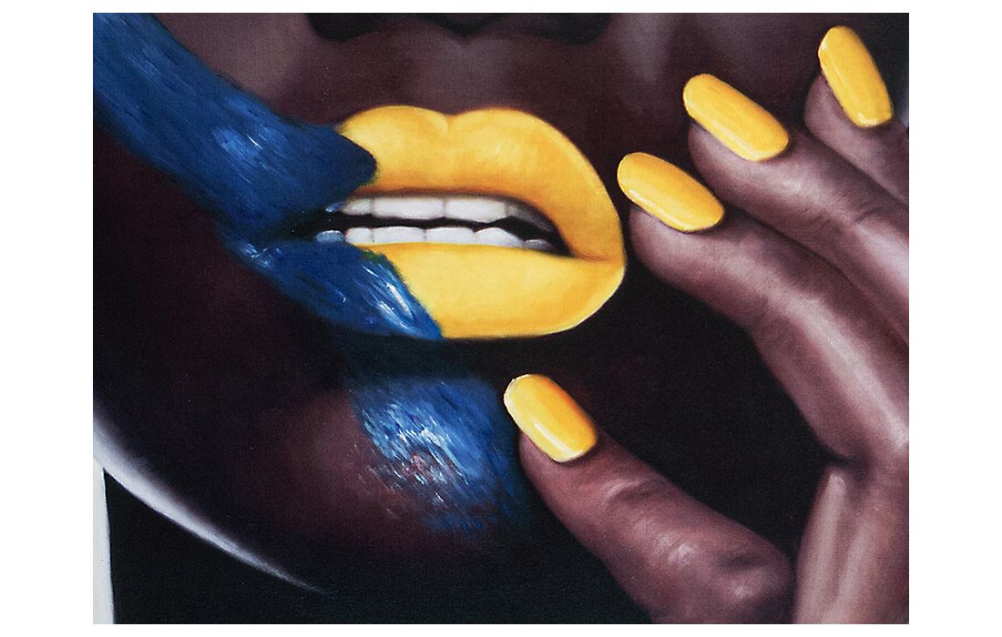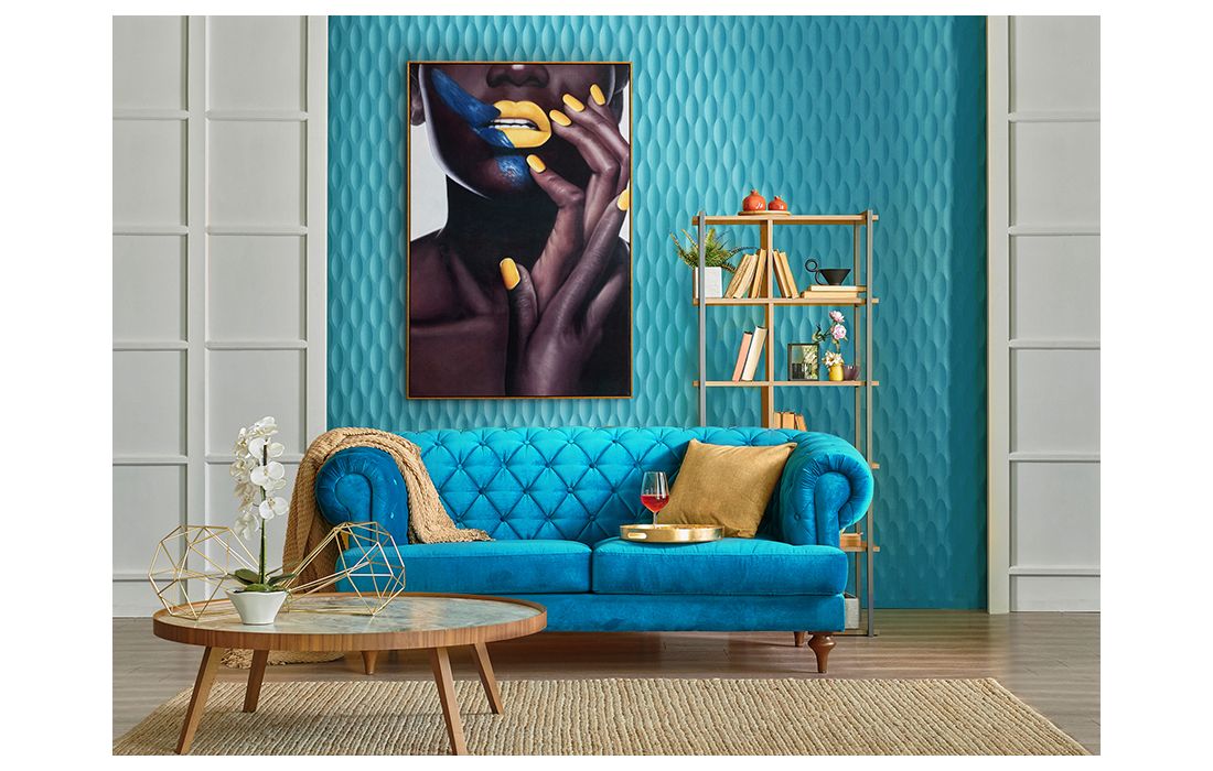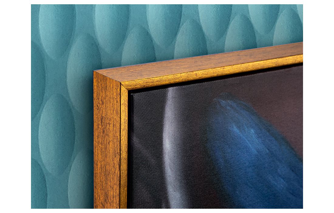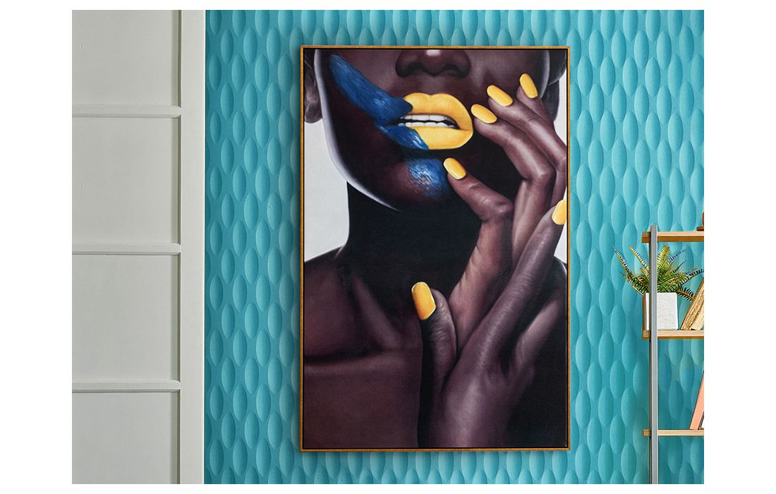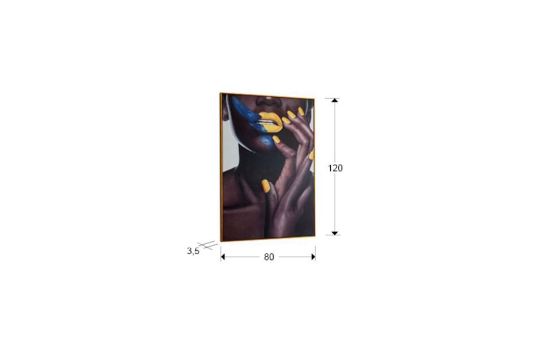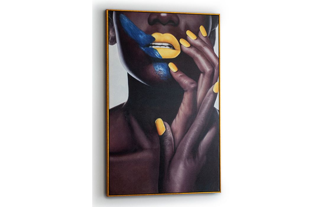 Printed screen of female face detail, MDF frame with satin black and gold finish.