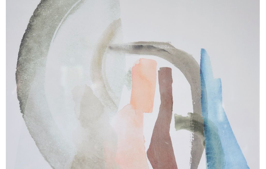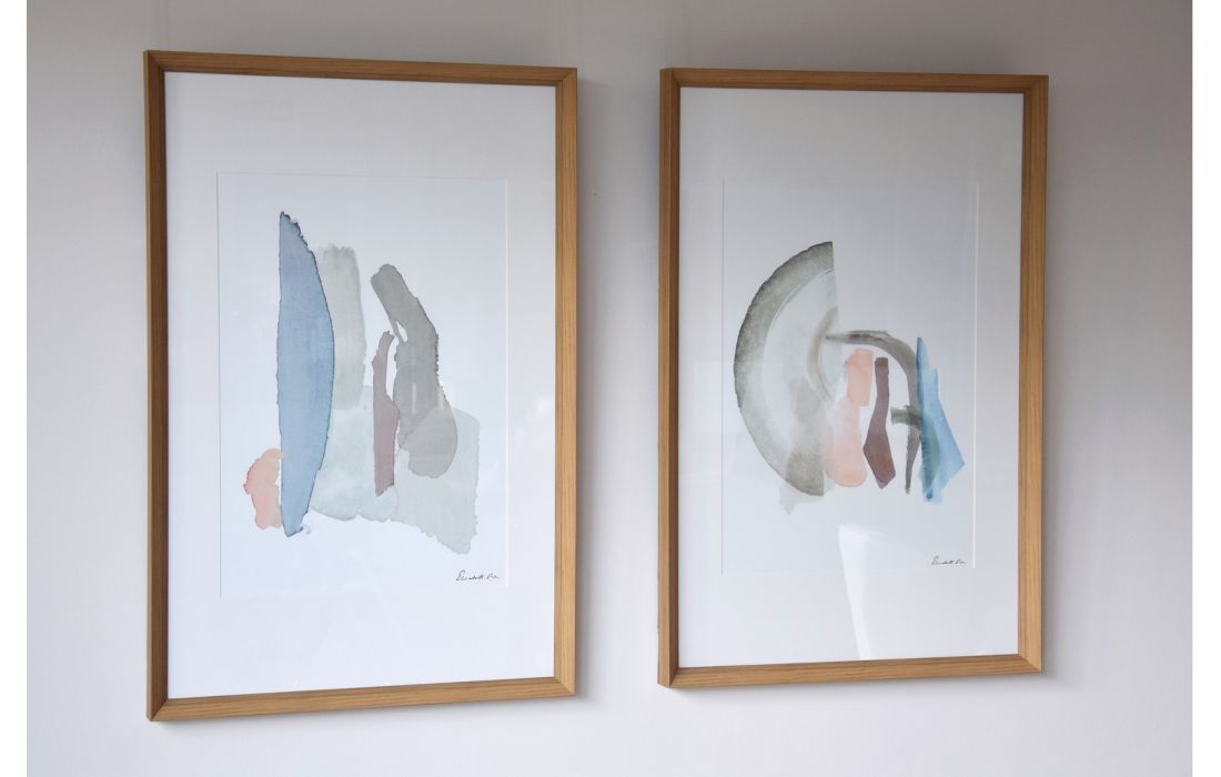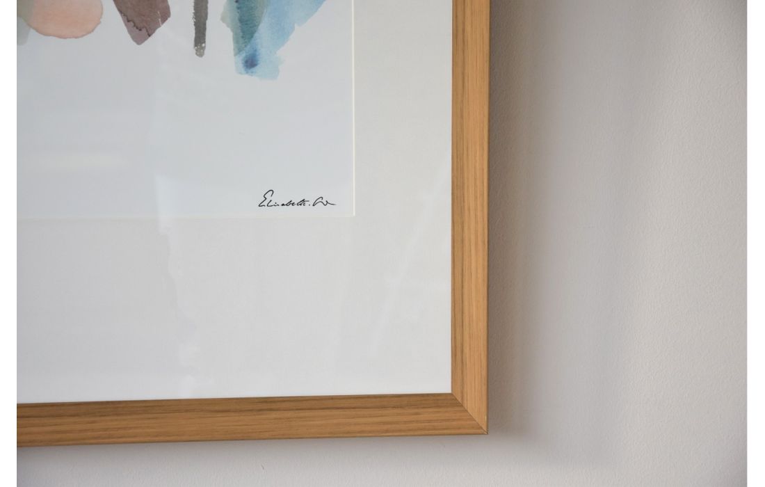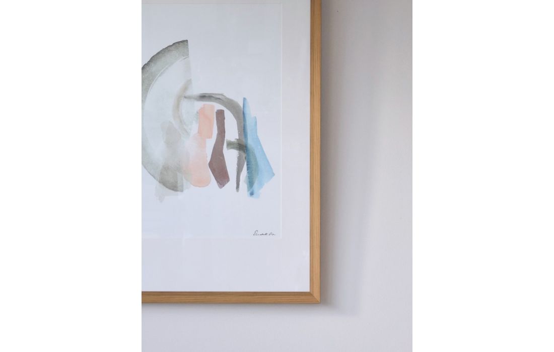 Hand-painted abstract painting on paper framed in glass with natural wood frame
