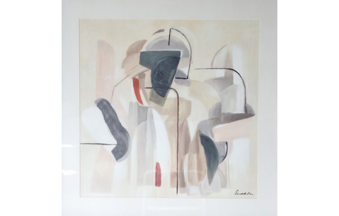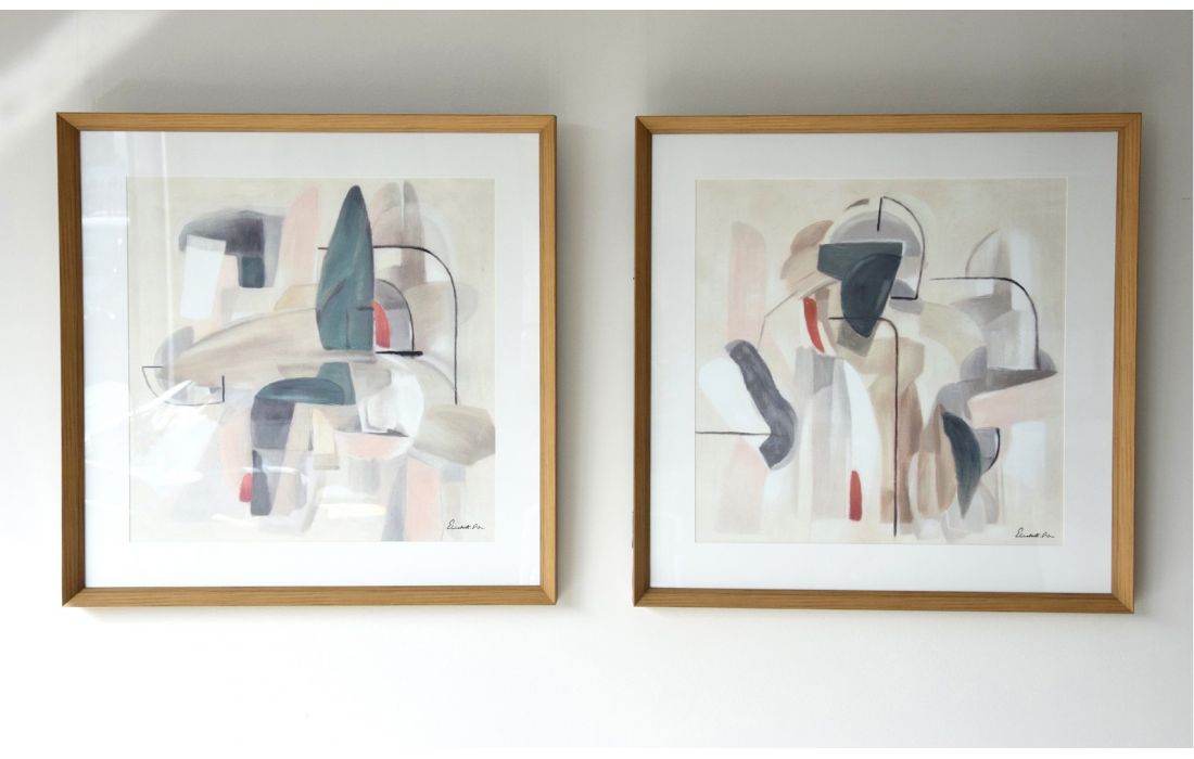Hand-painted abstract painting on paper framed in glass with natural wood frame