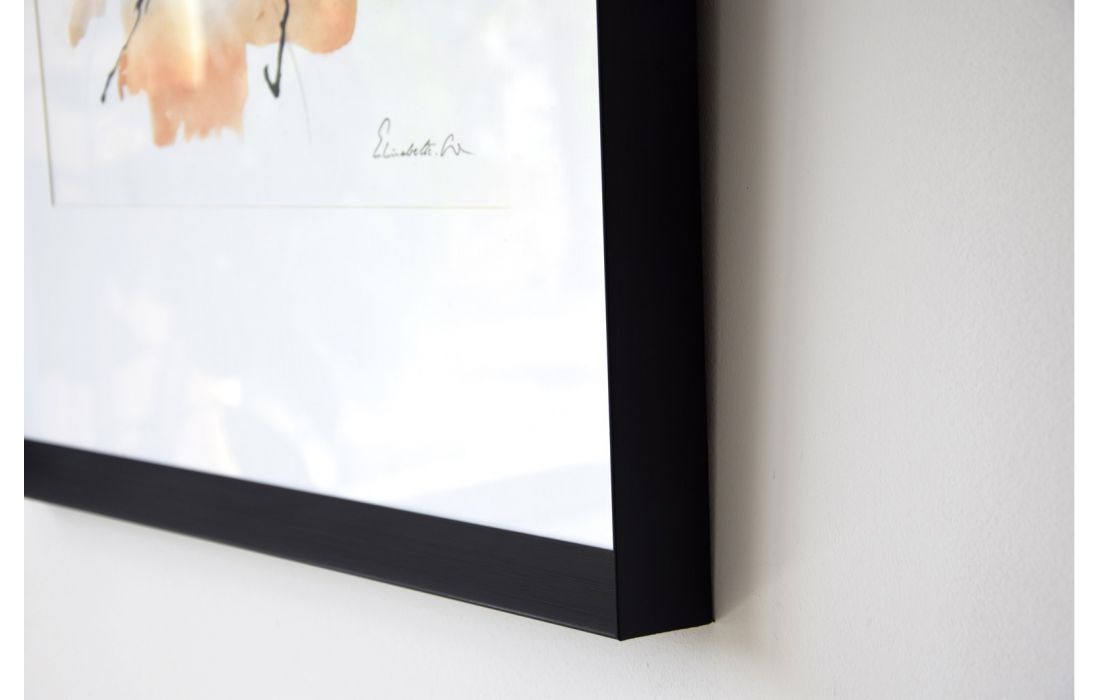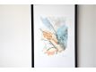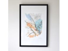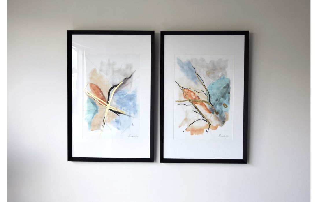 Abstract painting made by hand on paper with golden foil application. Framed in glass and with a black frame.