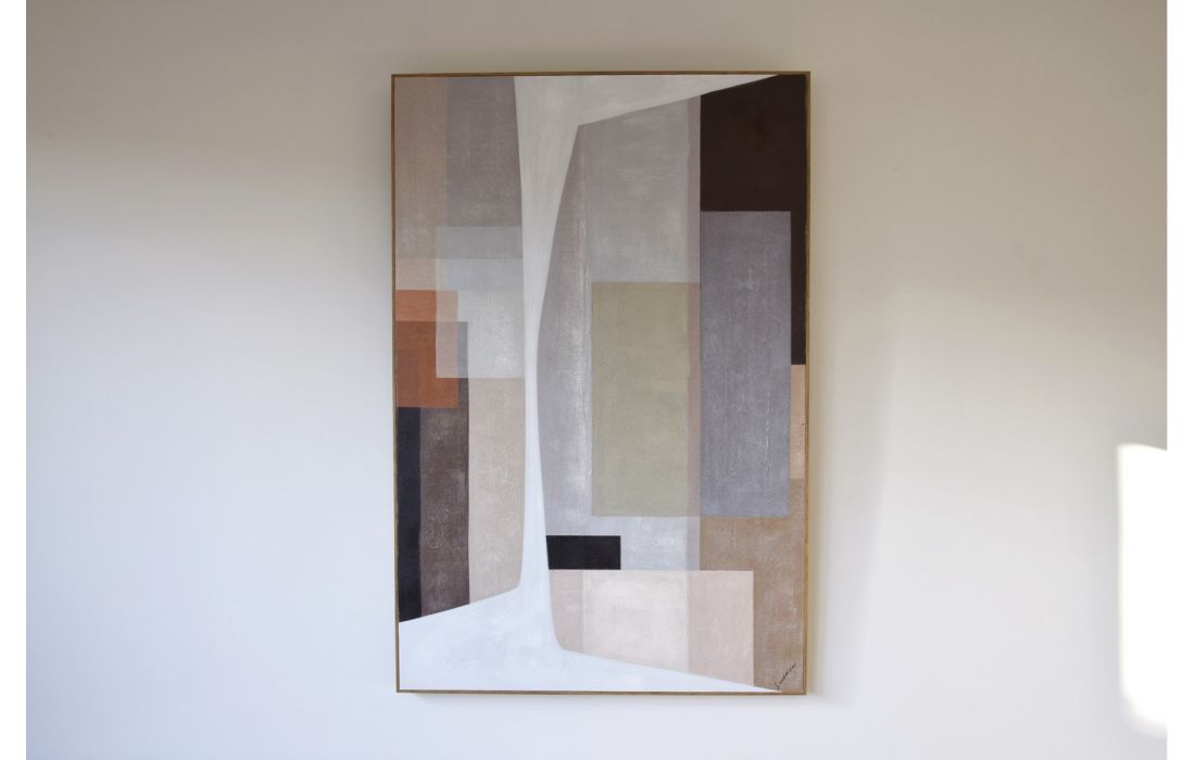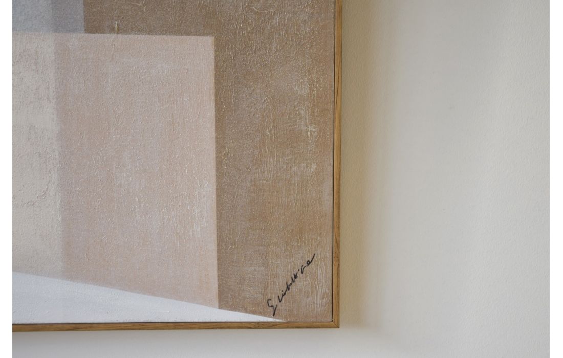 Handmade abstract painting on canvas in shades of white, beige, gray and black, with a wooden frame.