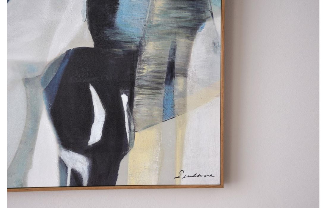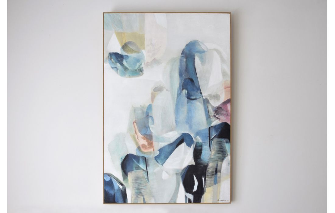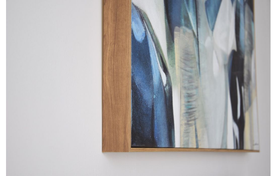 Abstract frame painted by hand with acrylic paint on canvas, in shades of blue, green and white with touches of pink and orange. Frame with wood color finishRecipient :