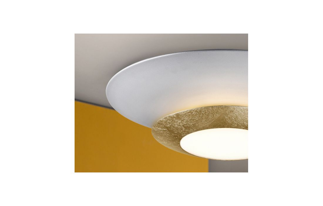 Ceiling lamp in metal, matt white finish. lower rim finished in gold leaf with opal acrylic diffuser.