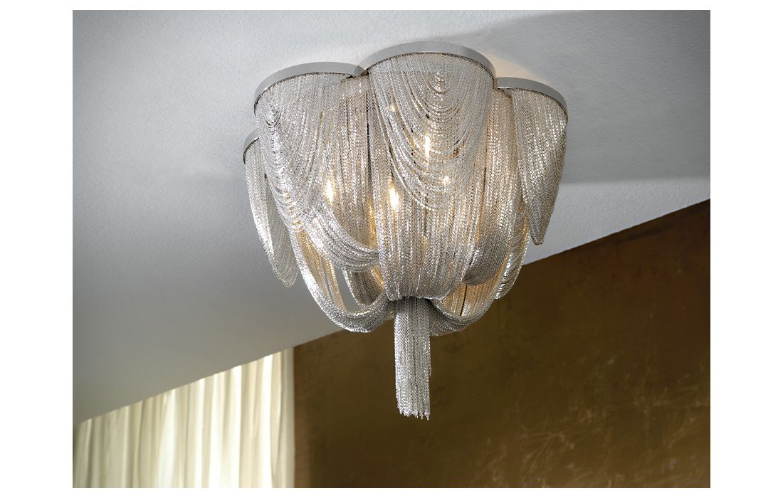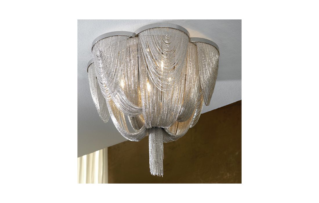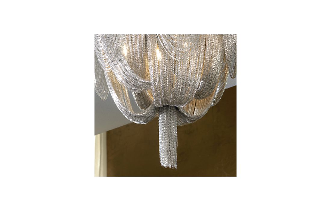 Ceiling lamp 10 lights, composed of chains thin nickel metal finishing that form the body of the lamp.