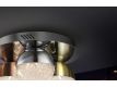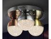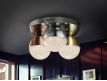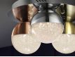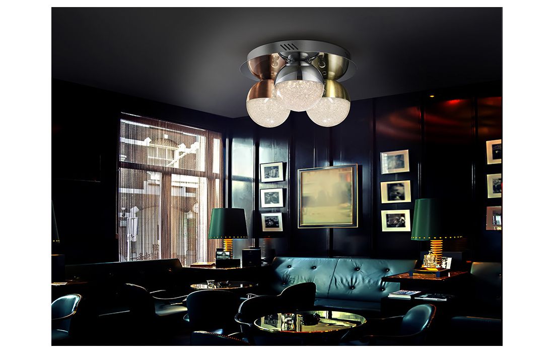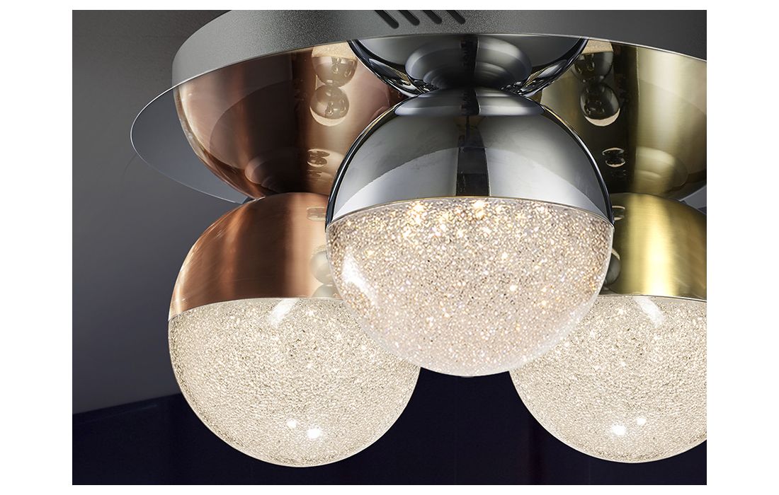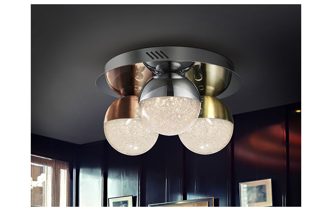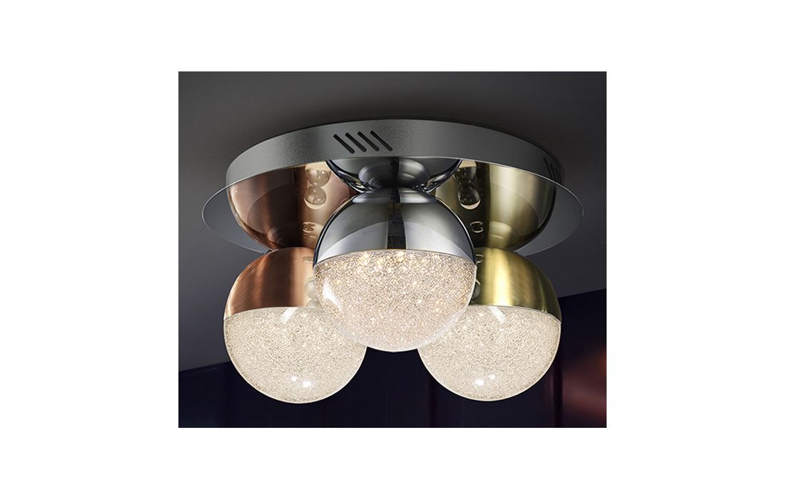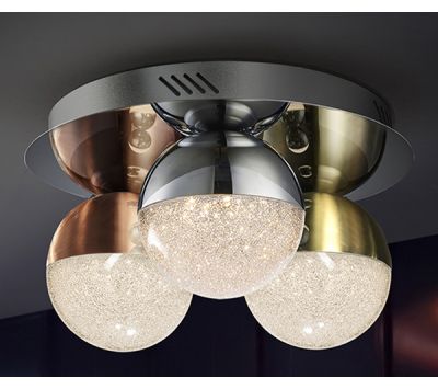 Ceiling lamp with 3 LED lights, made of chrome finish metal. Spherical 12 cm polycarbonate tulips with textured interior and metal, finished in satin copper, satin brass and chrome.