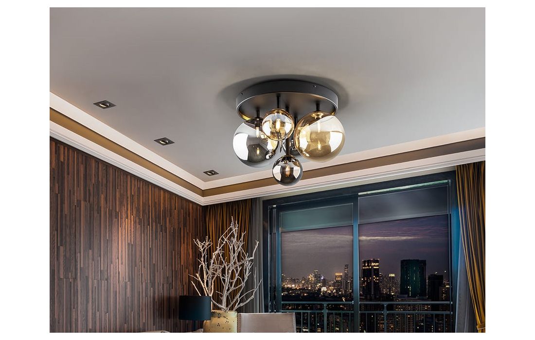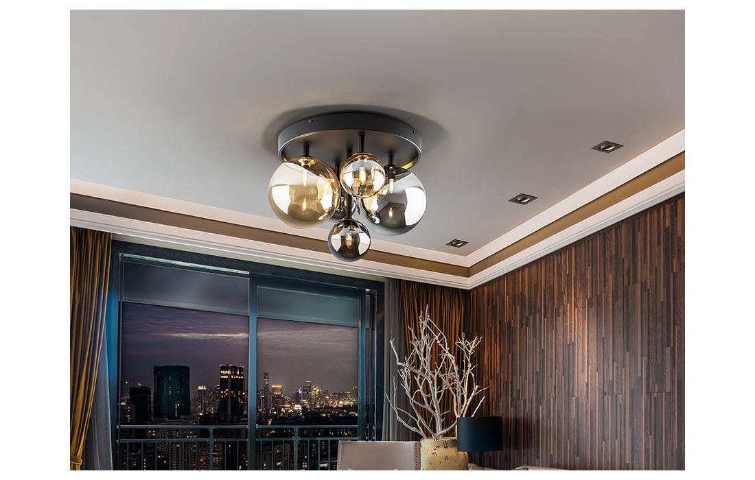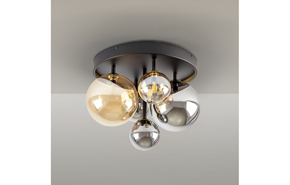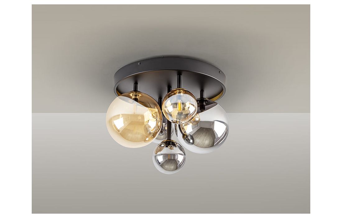 5-light metal ceiling lamp with matte black finish, satin brass details. Spherical glass lampshades measuring 12 and 20 cm, with amber and smoke gray mirrored finishes.