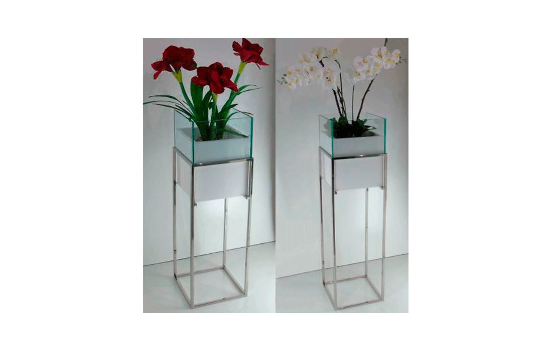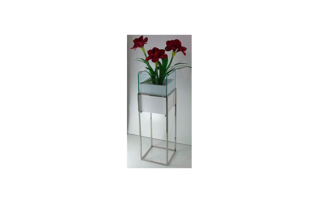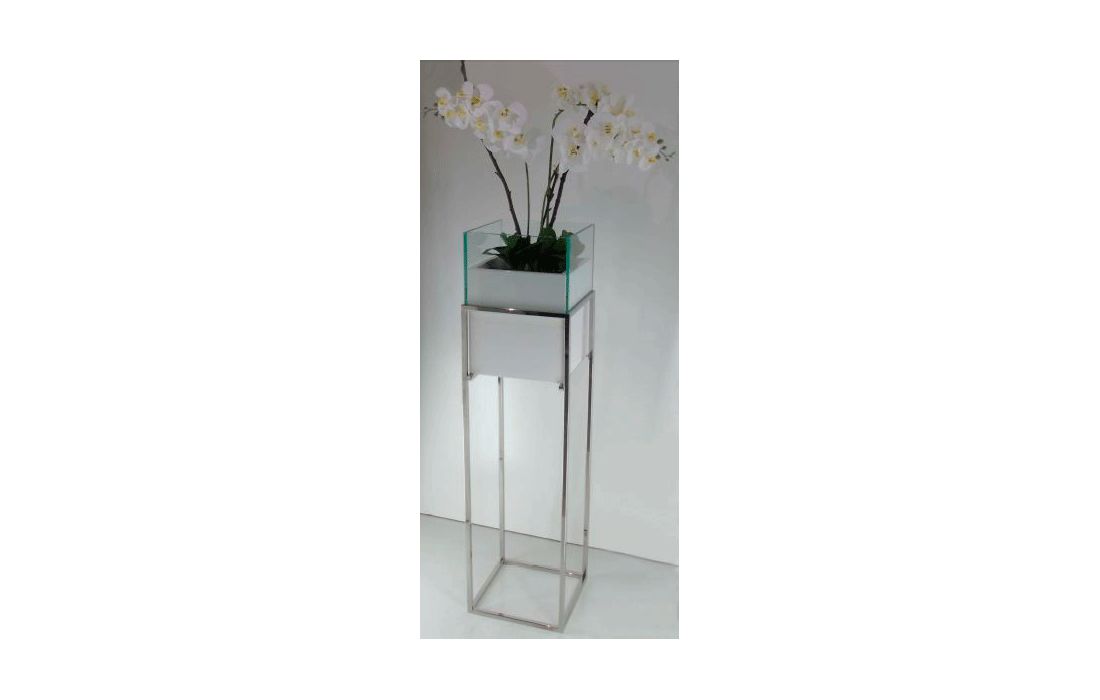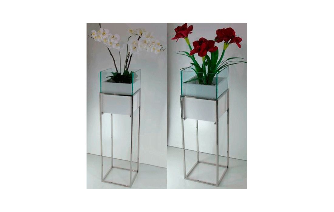 Flower pot with chrome-plated stainless steel frame and glass, white shine lacquered wooden vase.