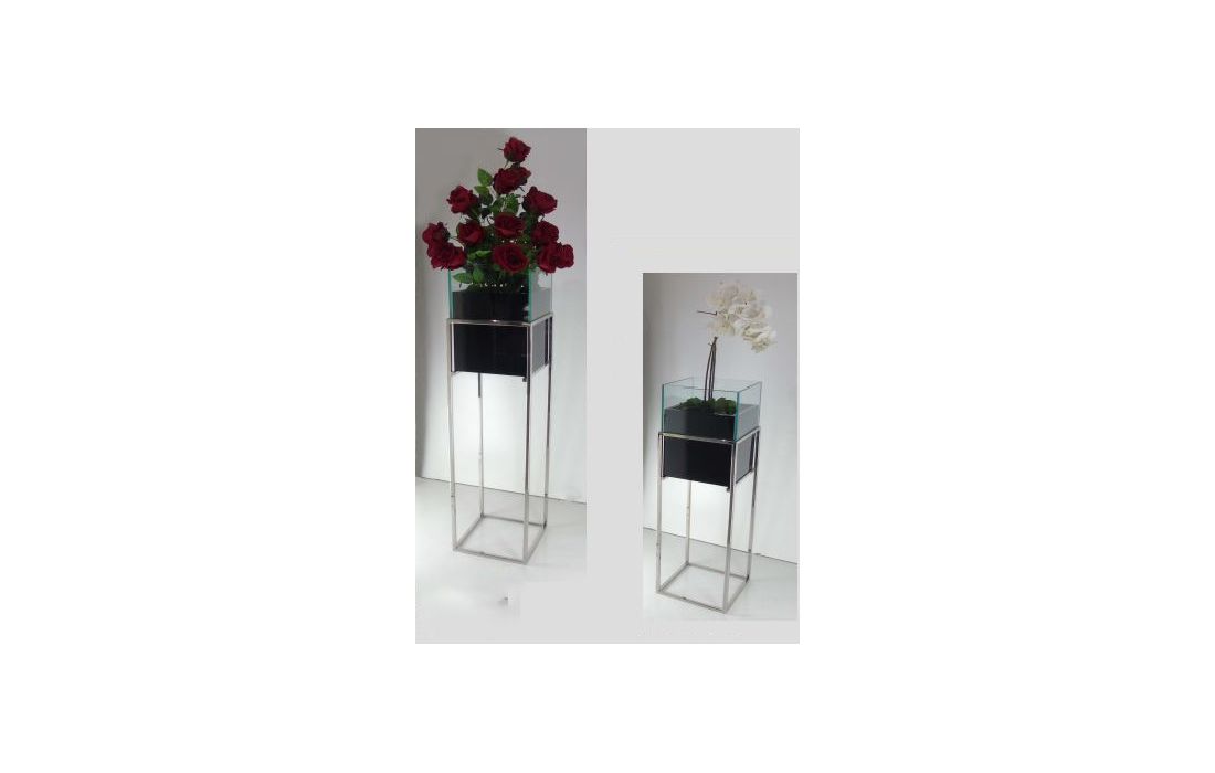 Flower pot with chrome-plated stainless steel frame and glass, black lacquered shine wooden vase.