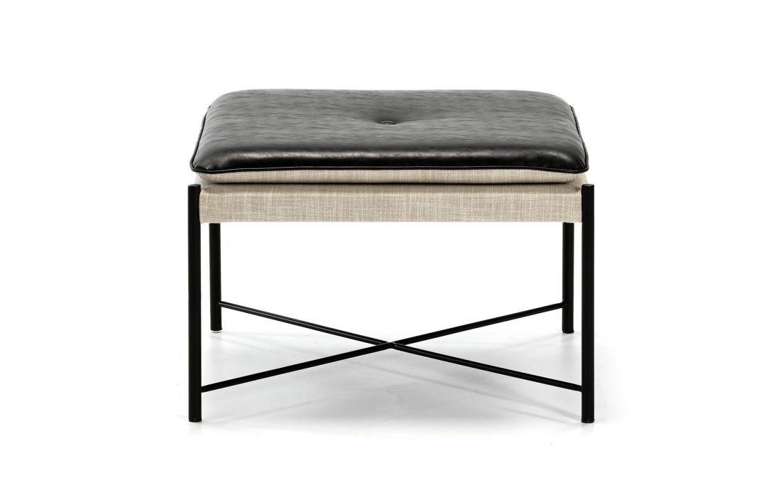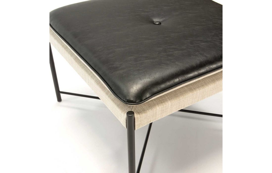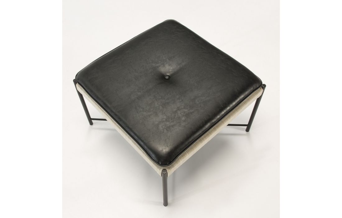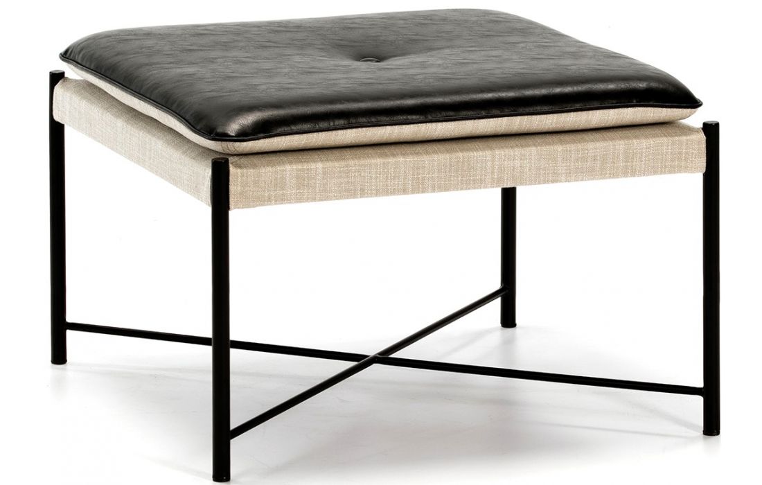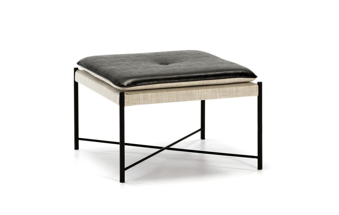 Decorative pouf with metalic frame and leather and fabric seat.