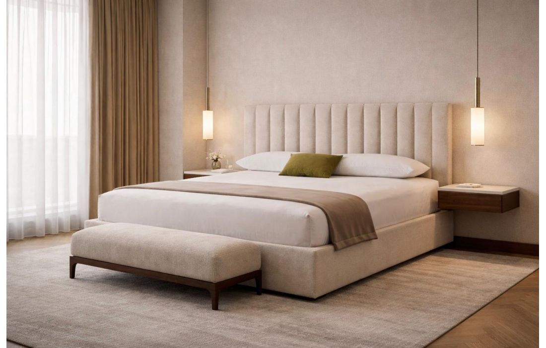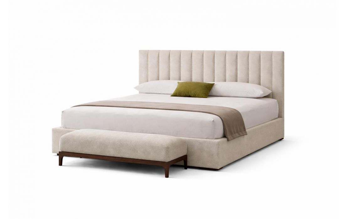 Fabric stool with an ash wood base painted in walnut color. Available in beige, blue, green, and gray fabric.For more color and fabric options, please contact us. Dimensions in cm W 140 D 40 H 35