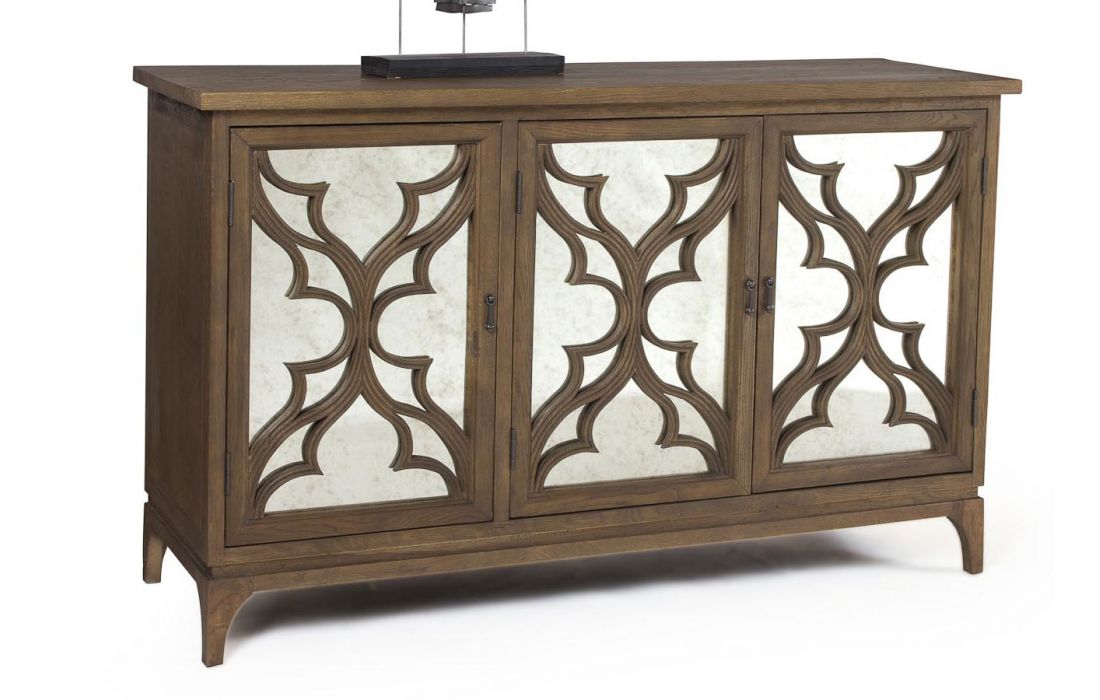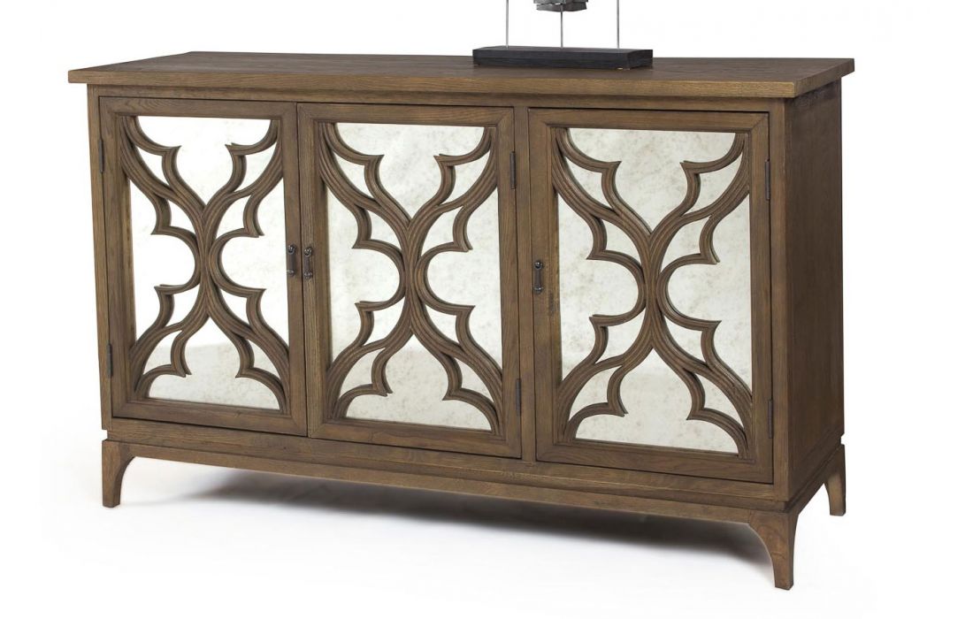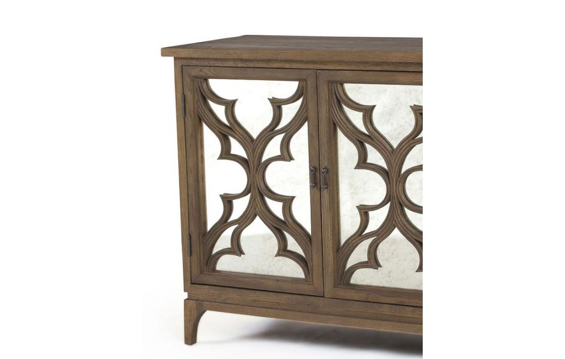 Classic sideboard 3 doors, oak wood structure, detail of aged glass doors.