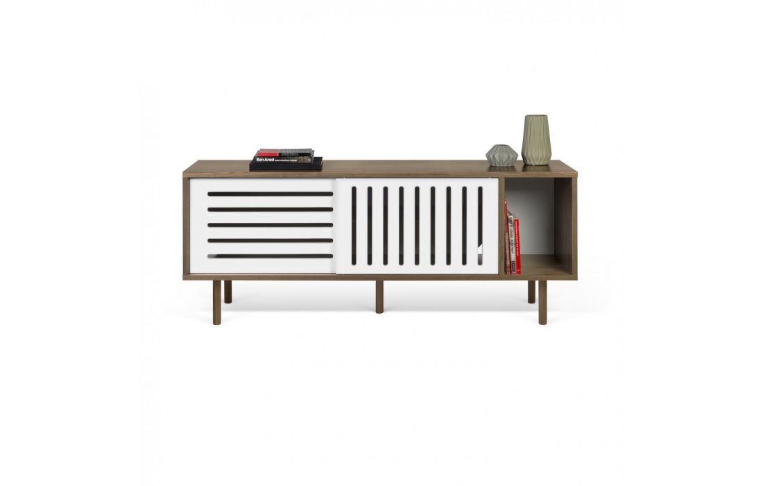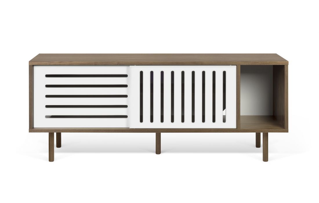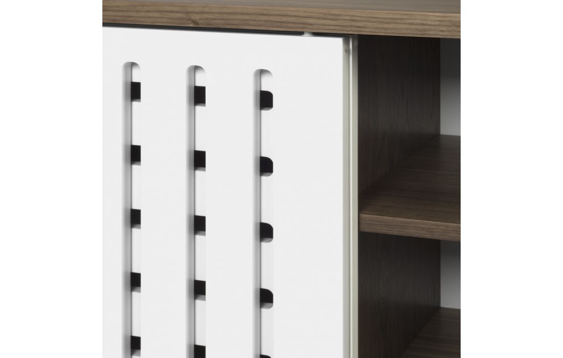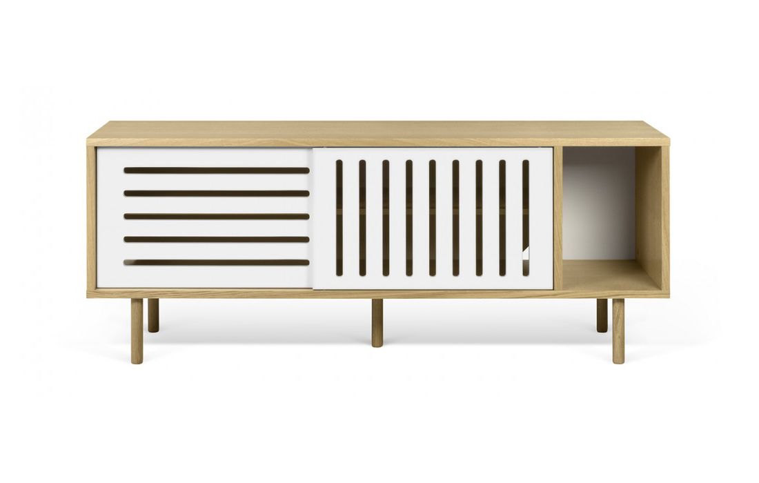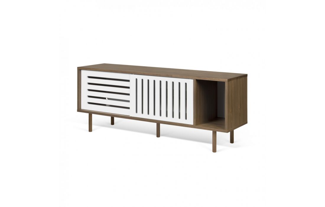 Sideboard with 2 sliding doors 1 shelf inside each compartment, and one compartment open for storage.