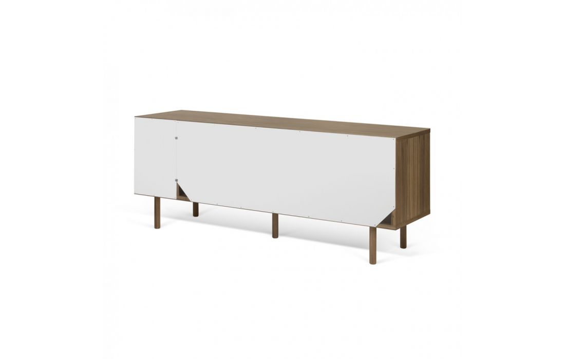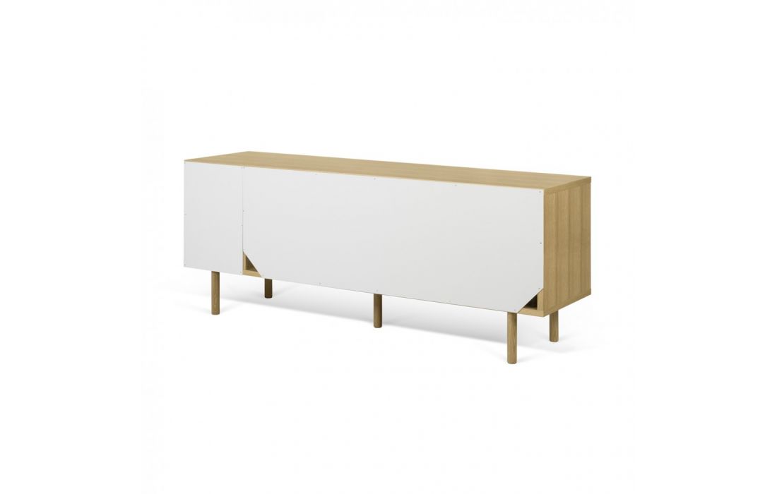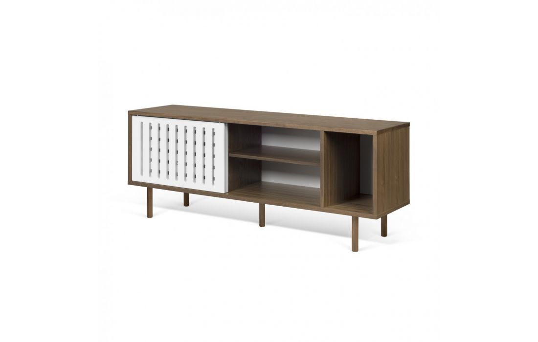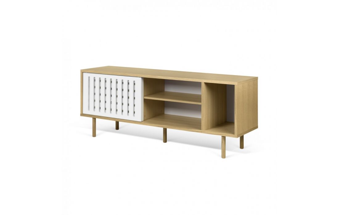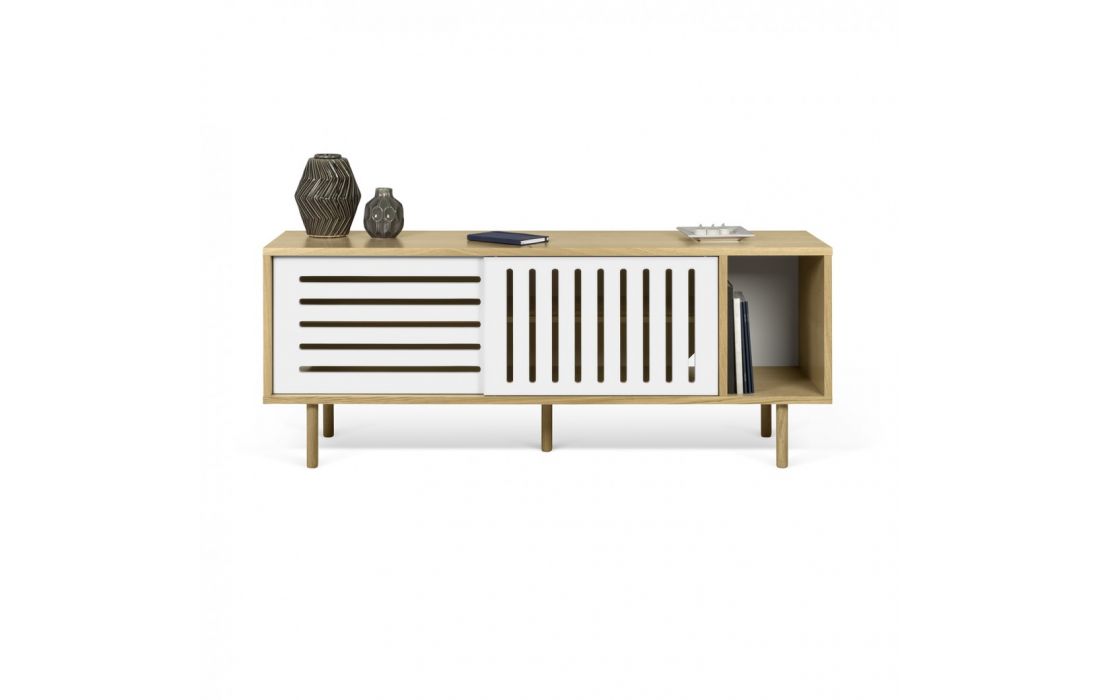 Sideboard with 2 sliding doors 1 shelf inside each compartment, and one compartment open for storage.