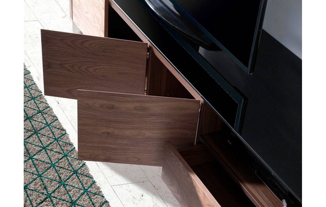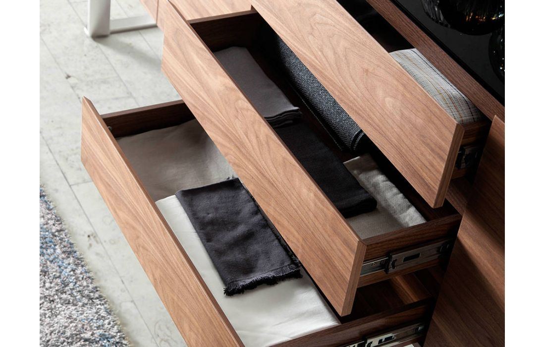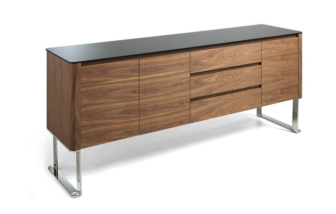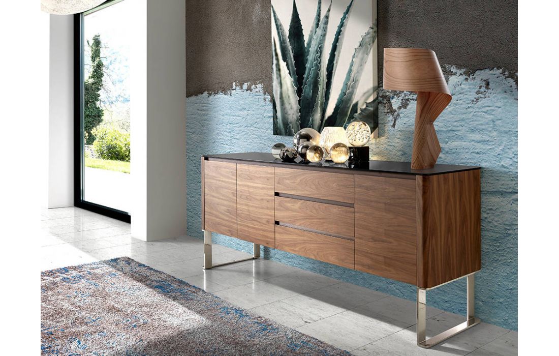 Modern sideboard with walnut MDF structure and stainless steel legs, glass top and has ample storage with 3 drawers and 3 doorsRecipient :