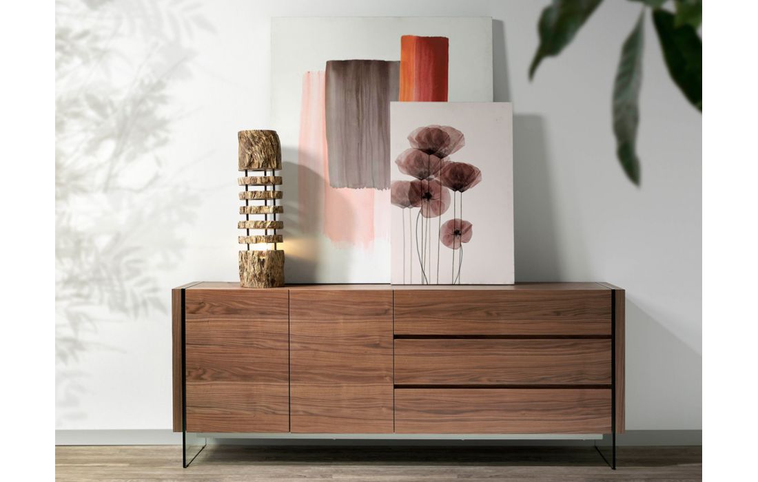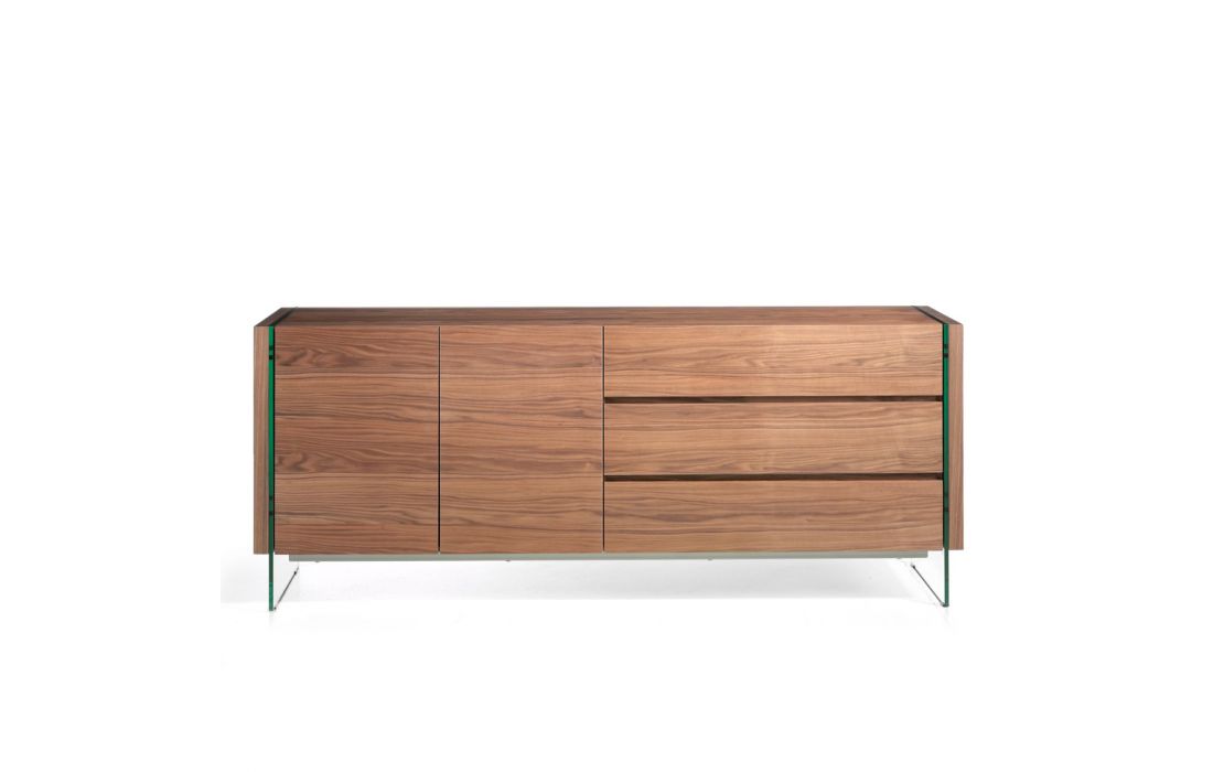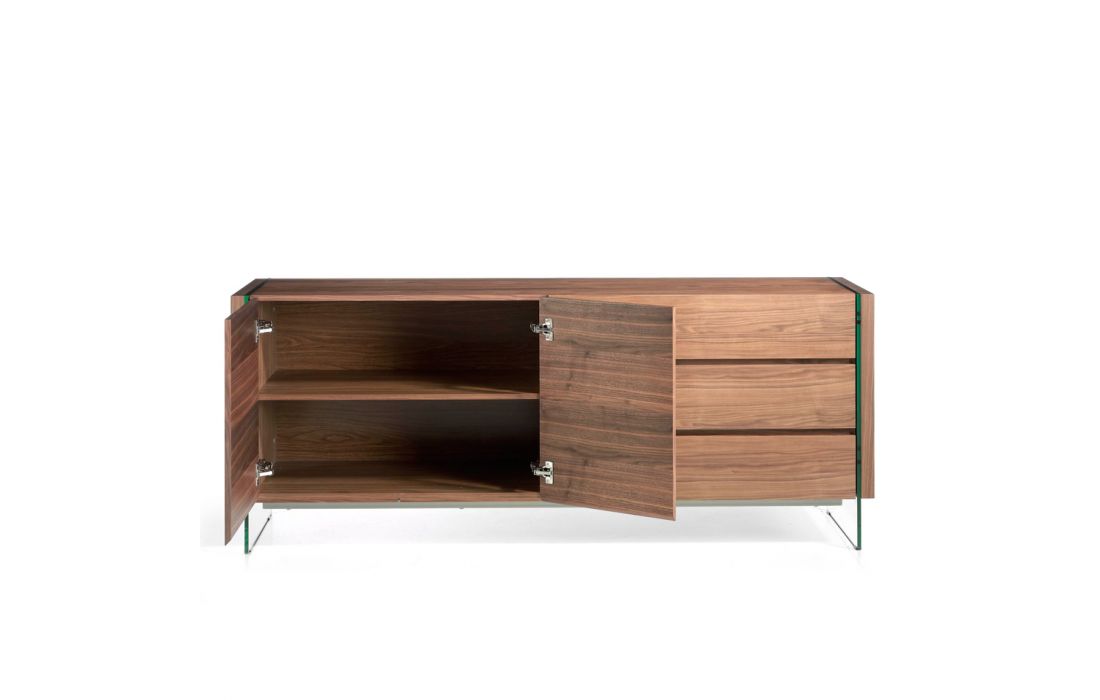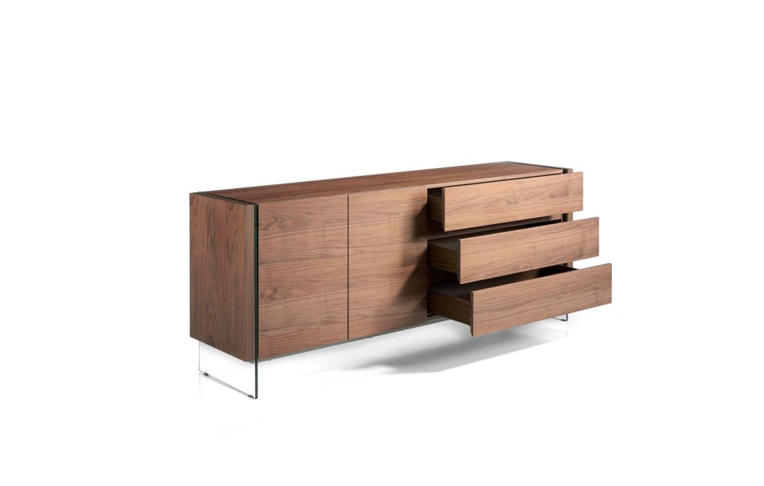 Modern design sideboard with natural walnut MDF structure and tempered glass legs, with 3 drawers and 2 doorsRecipient :