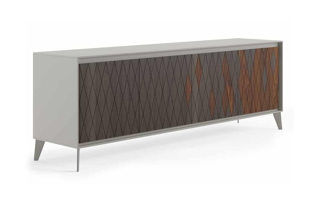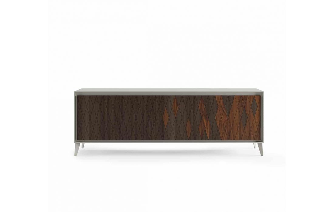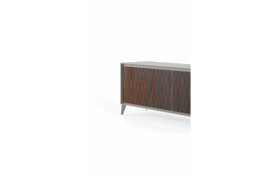 Sideboard in MDF with lacquered structure and feet in lacquered iron. Doors with fusion of ironwood leaf and smoked eucalyptus. Interior shelves and a central drawer.