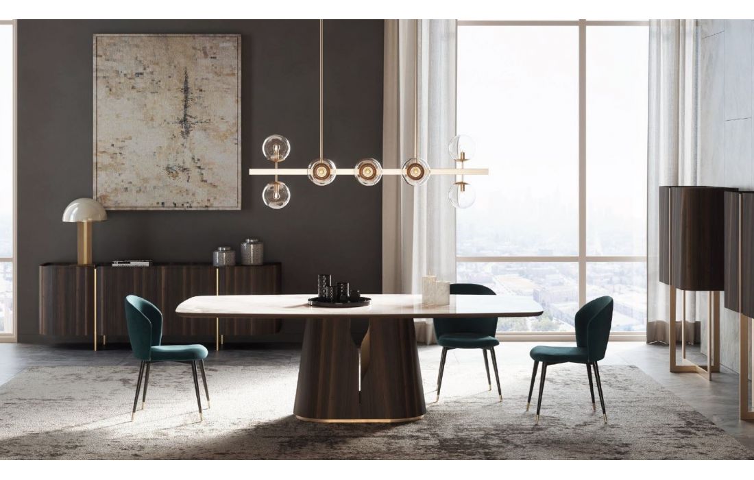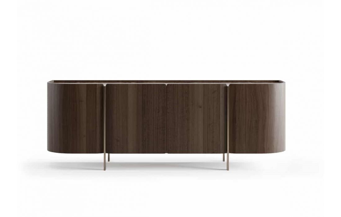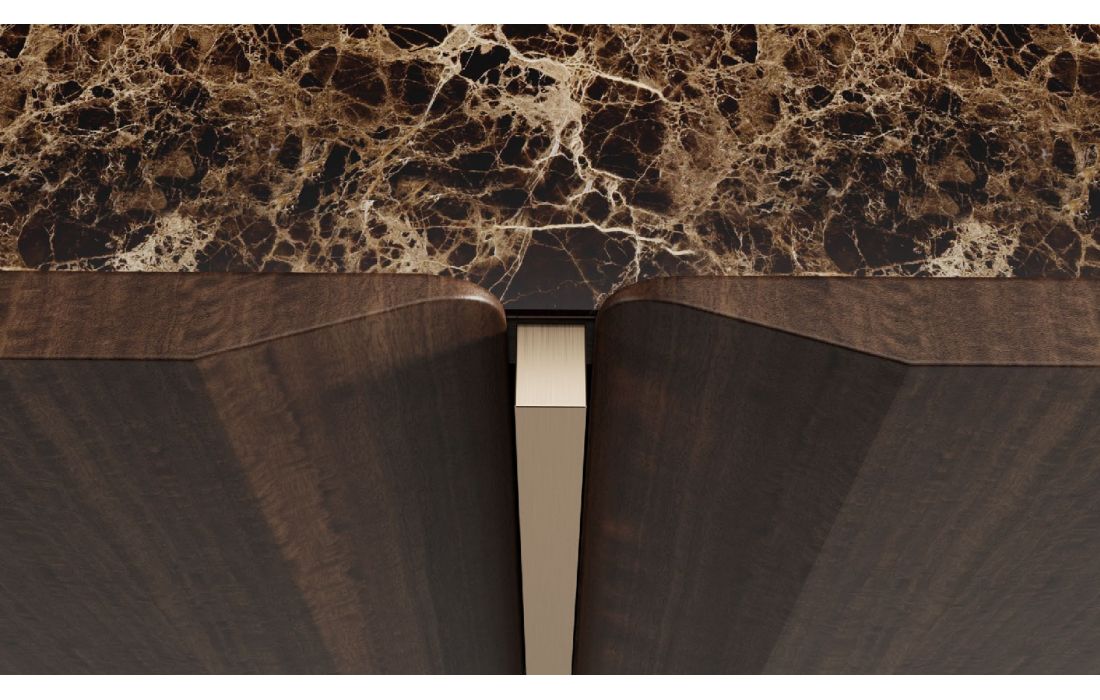 Sideboard in MDF with smoked eucalyptus structure and doors, stainless steel feet with old gold finish and imperador ceramic top. Interior with four niches, shelves and two drawers.