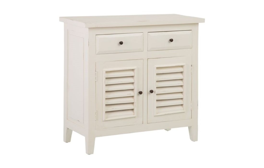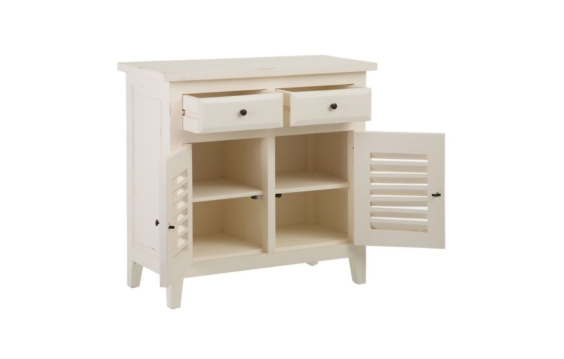 Sideboard in Mindi wood with 2 doors, 2 drawers, with included shelves and metal handles.
