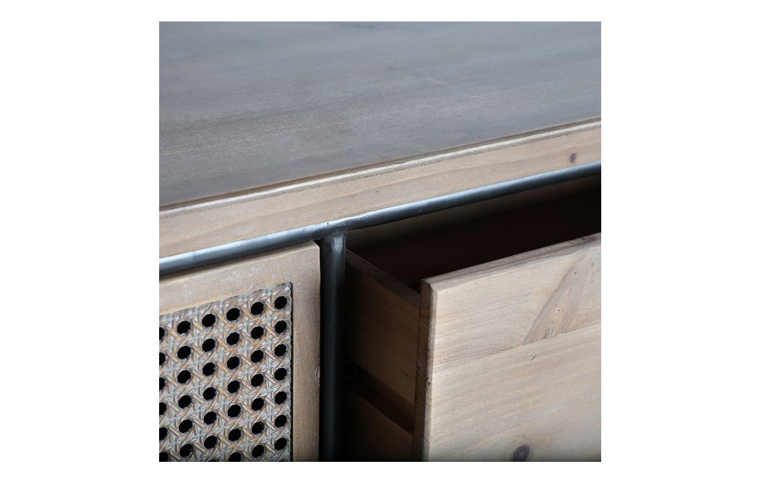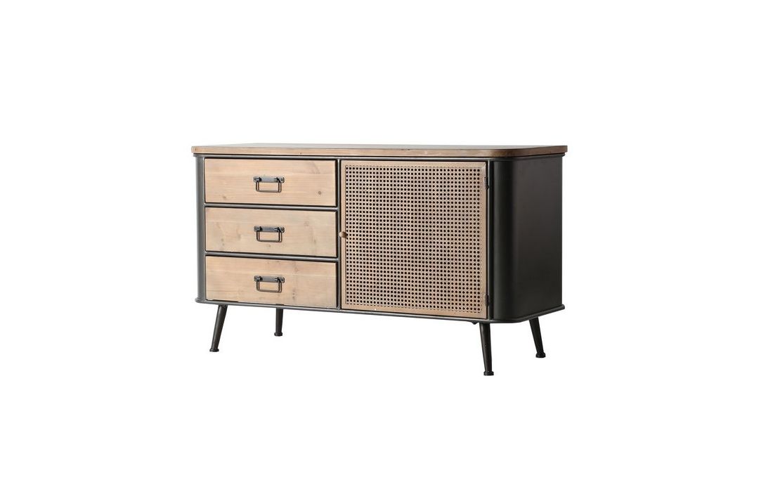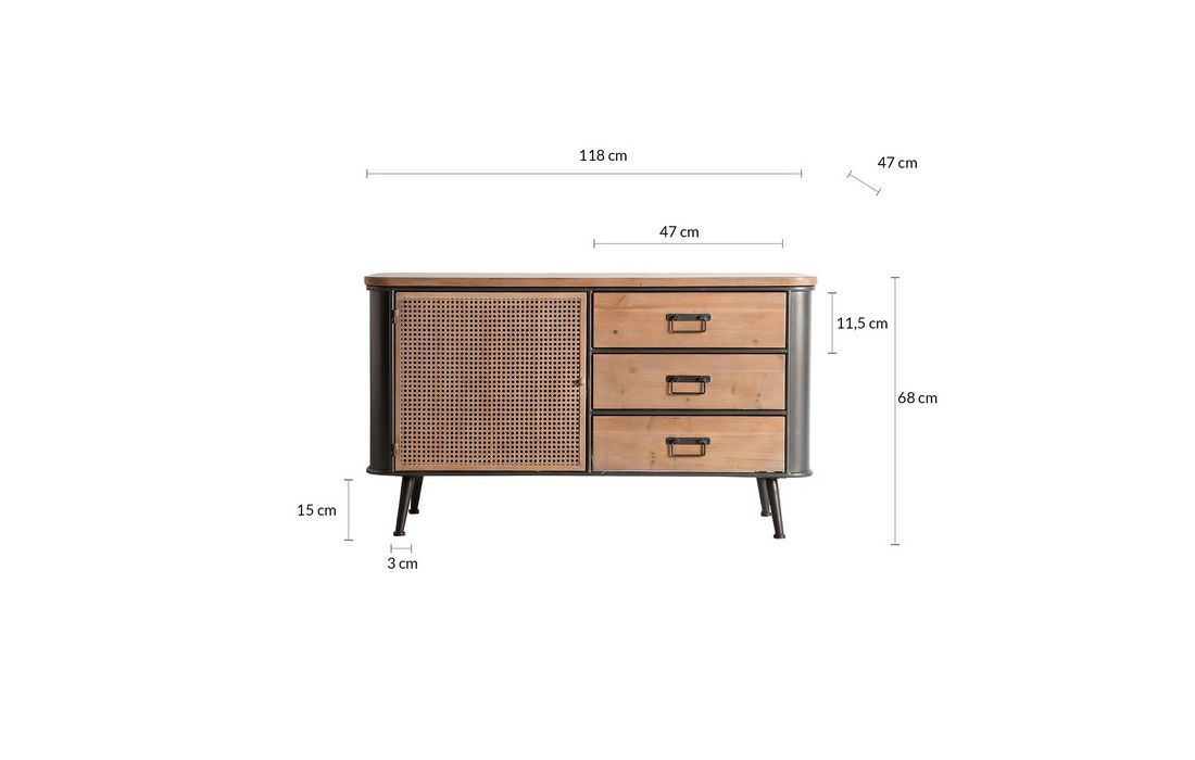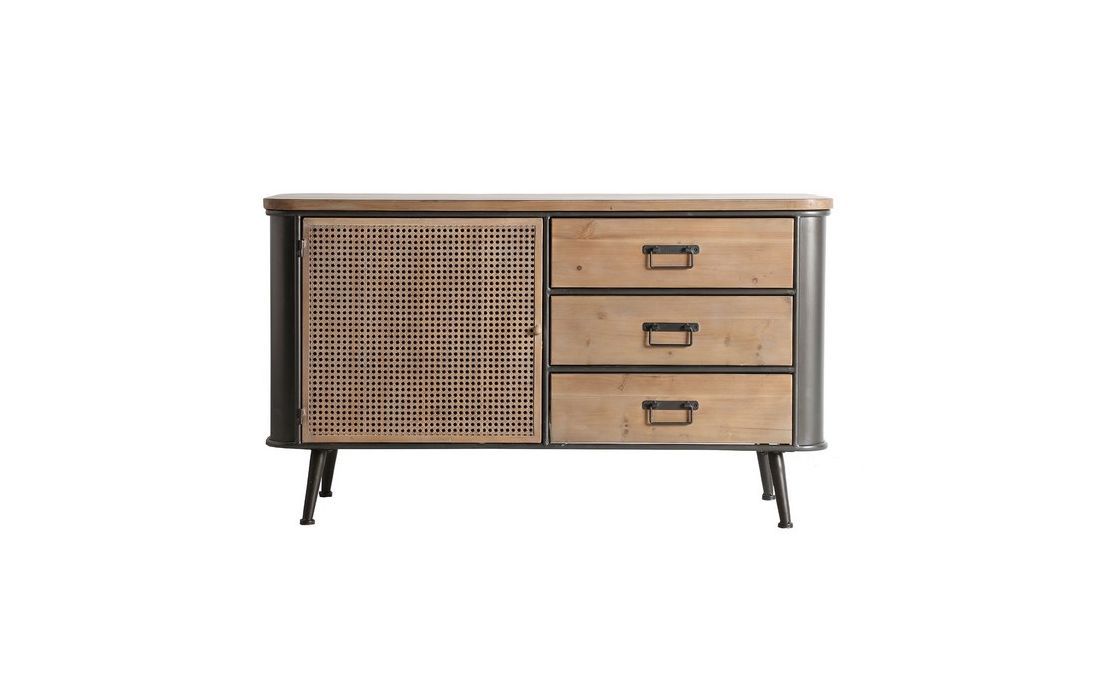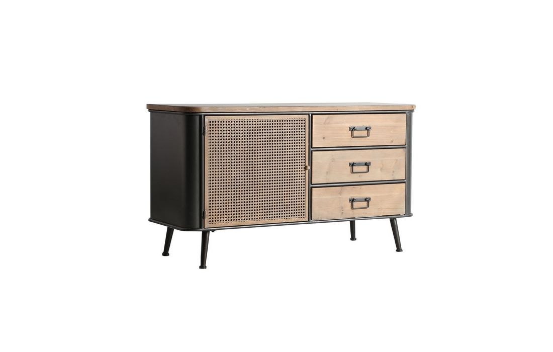 Sideboard in spruce wood and iron, with 3 drawers and a door with a metal grille finish.