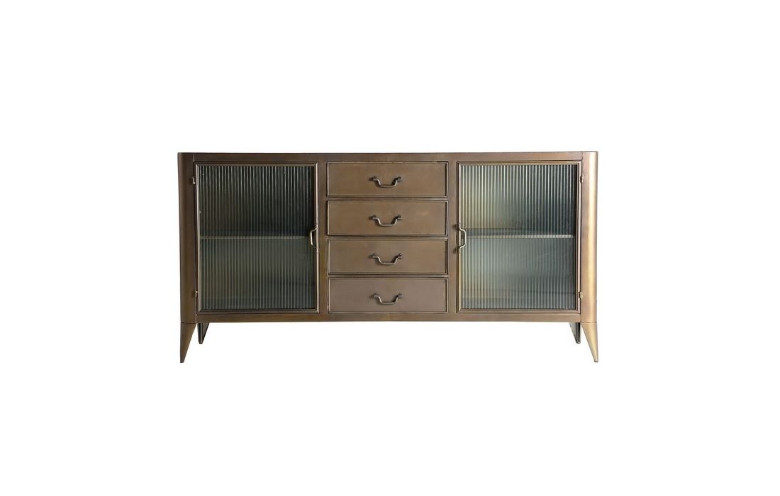 Sideboard composed of a metal structure made entirely of aged golden-toned iron with two opaque and wavy glass doors.