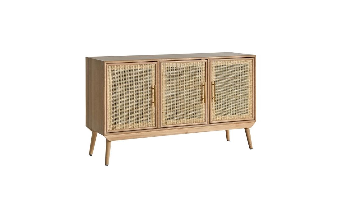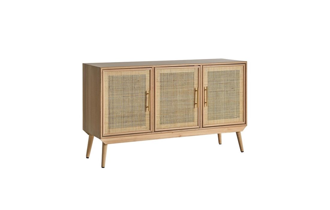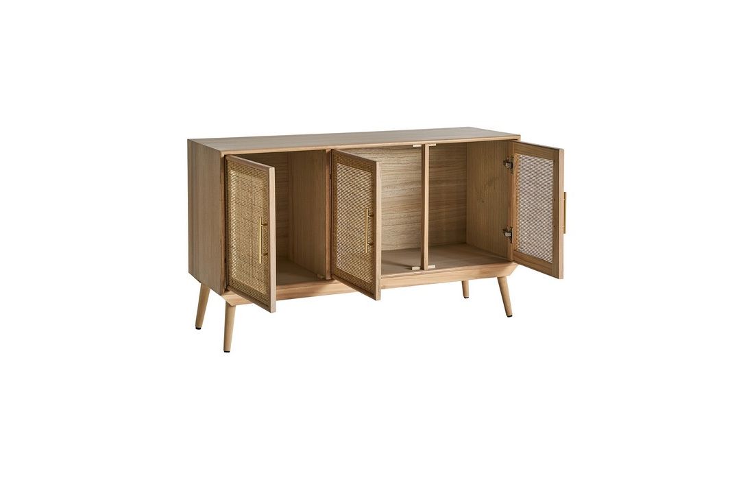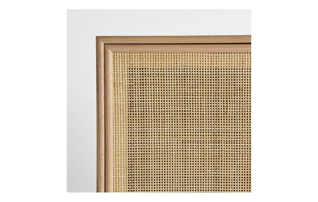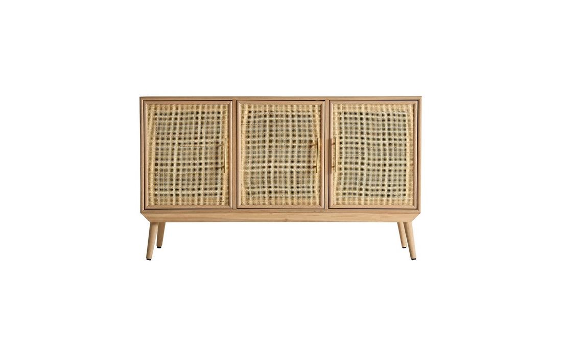 Sideboard made with pine wood in its natural color and MDF, with two straw doors and golden handles.