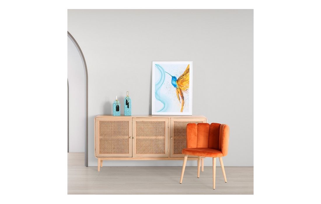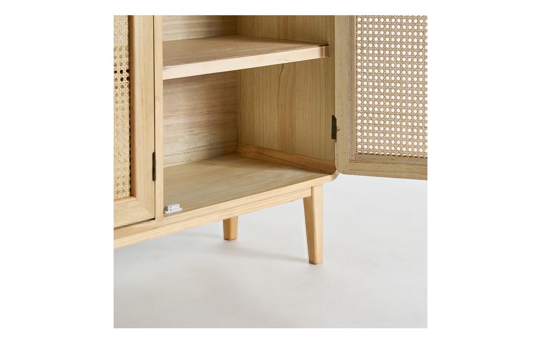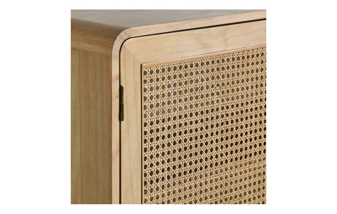 Sideboard made with pine wood in its natural color and MDF, with three straw doors and golden handles.