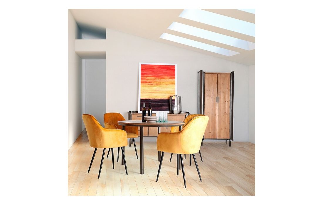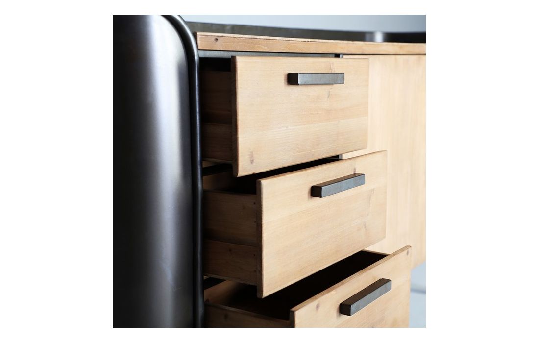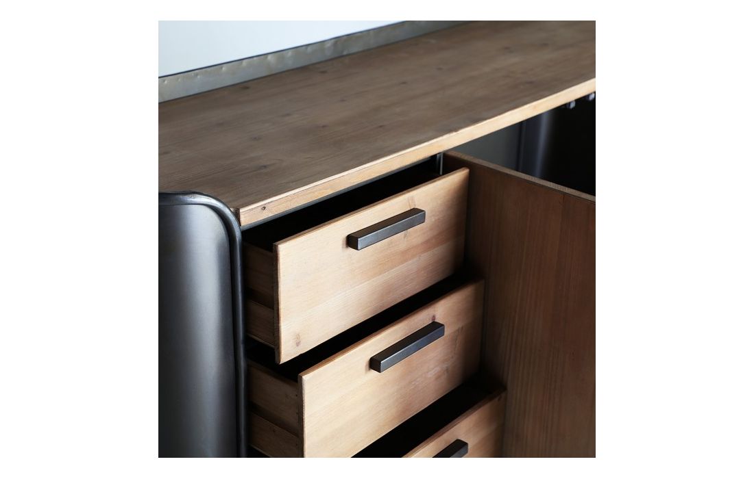 Sideboard in gray and natural color made of fir wood combined with iron and MDF.