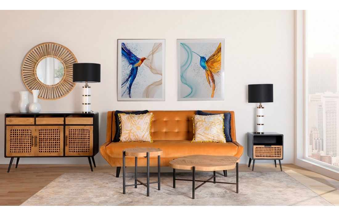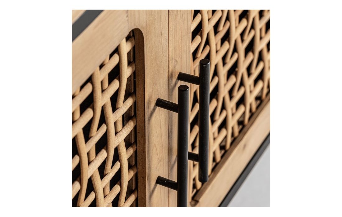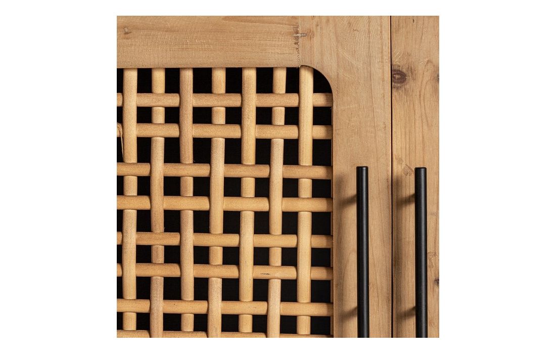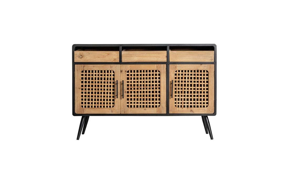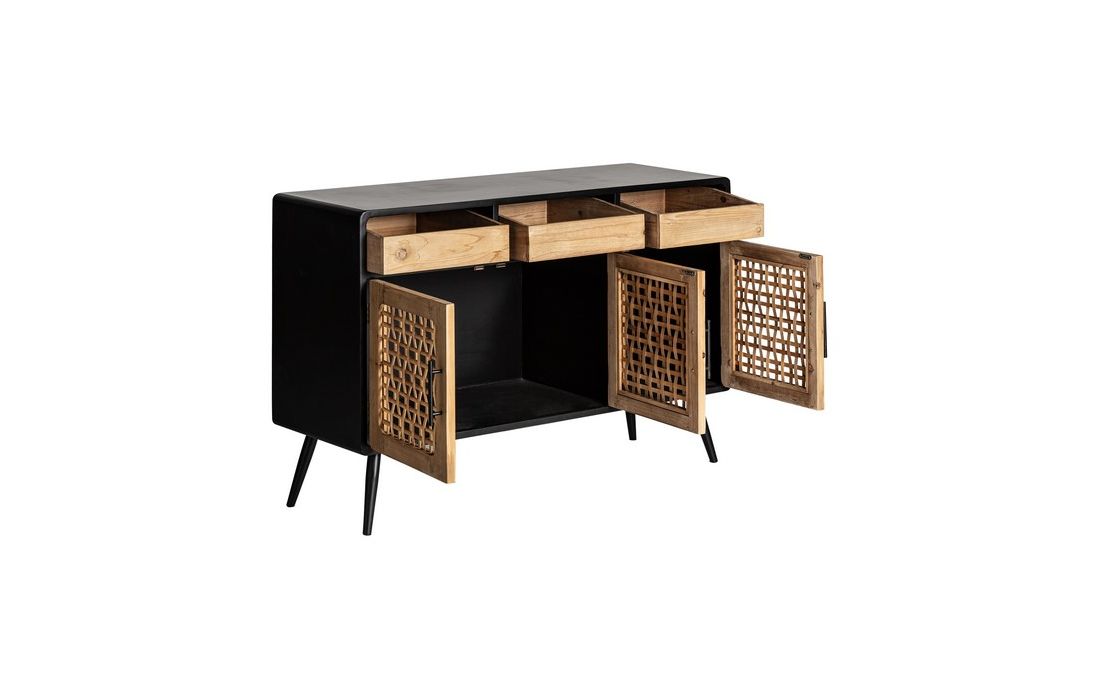 Sideboard in black and in the natural color of spruce wood. It consists of a smooth and simple structure in black and three drawers and doors made of natural wood mesh.