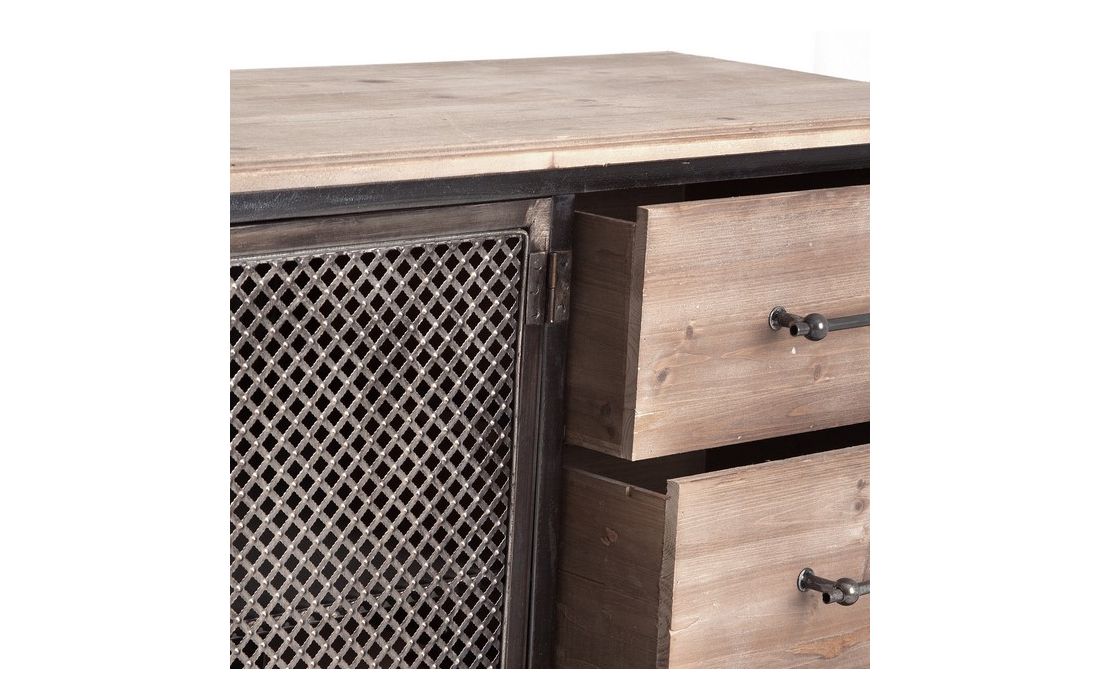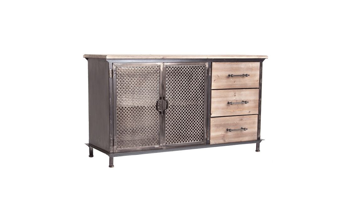 Aparador composto por uma estrutura metálica preta combinada com três gavetas e um tampo em madeira de abeto.