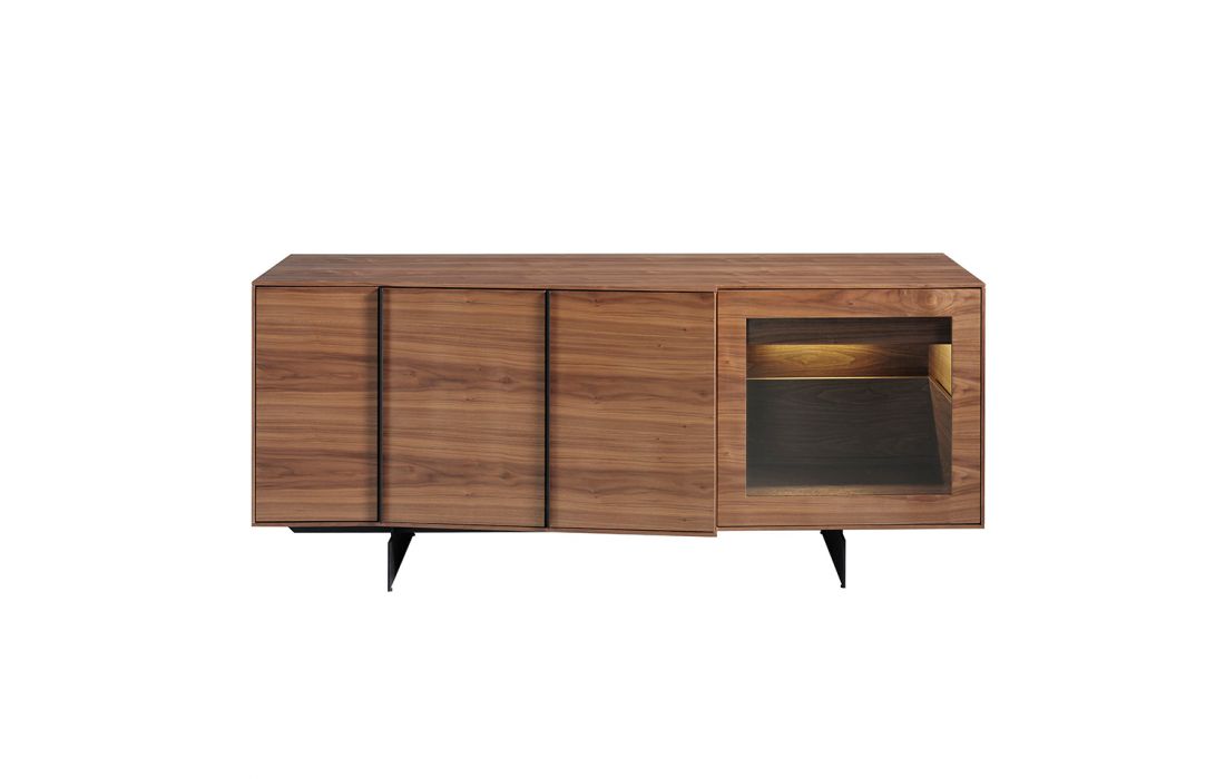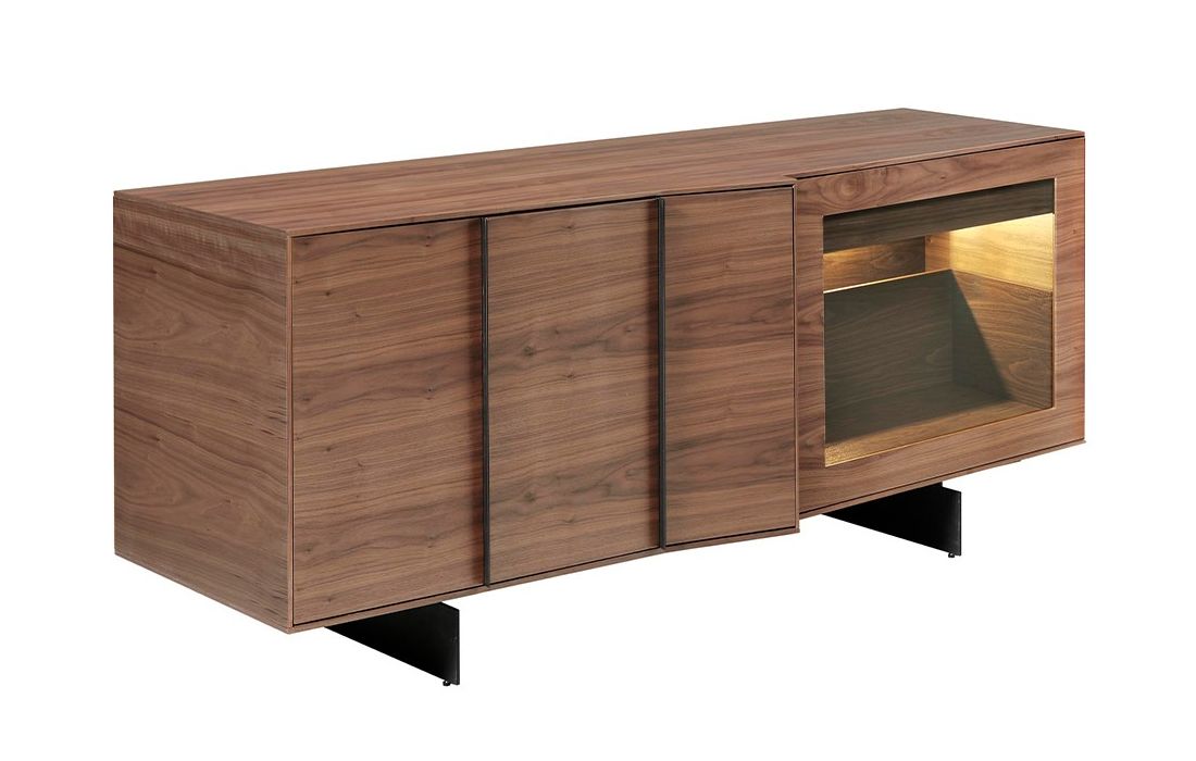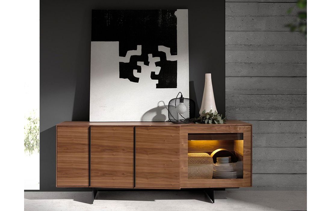 Sideboard in natural walnut veneered wood with three cabinets and two drawers. Exterior drawer with interior LED lighting.