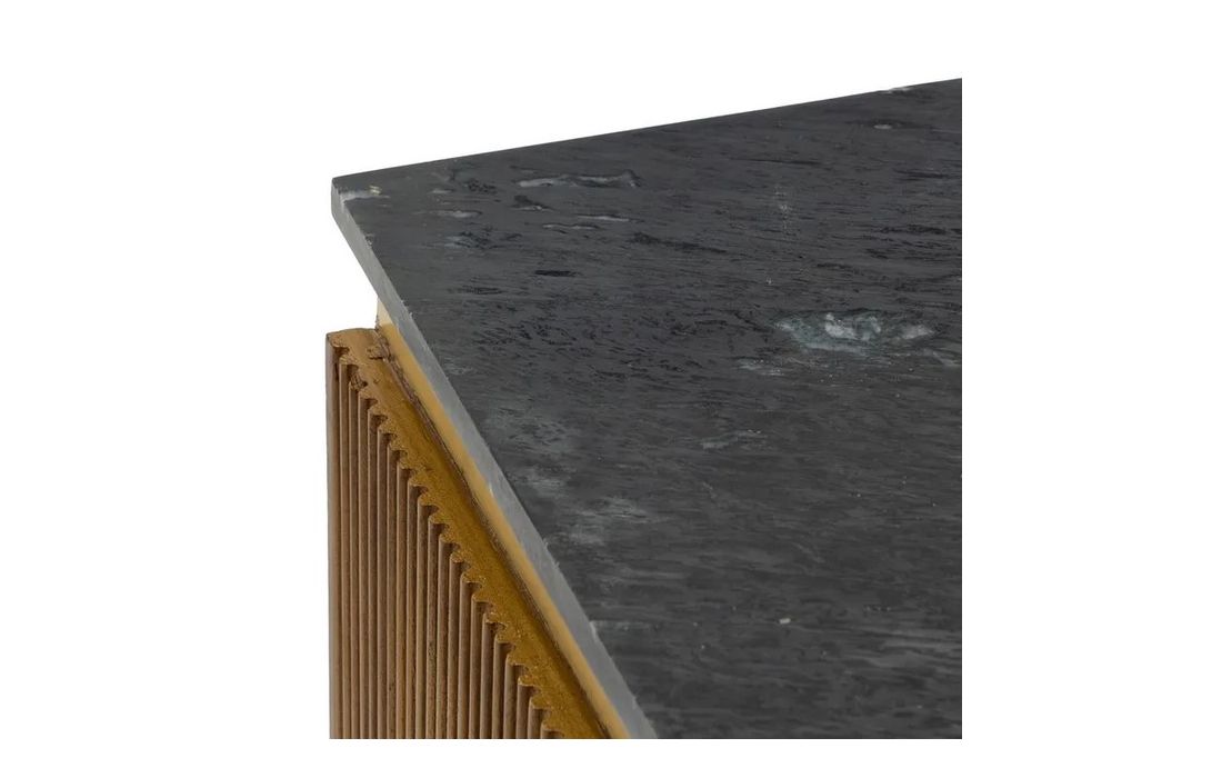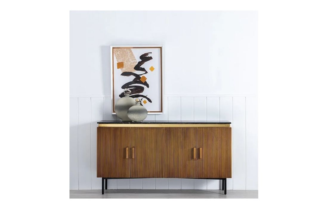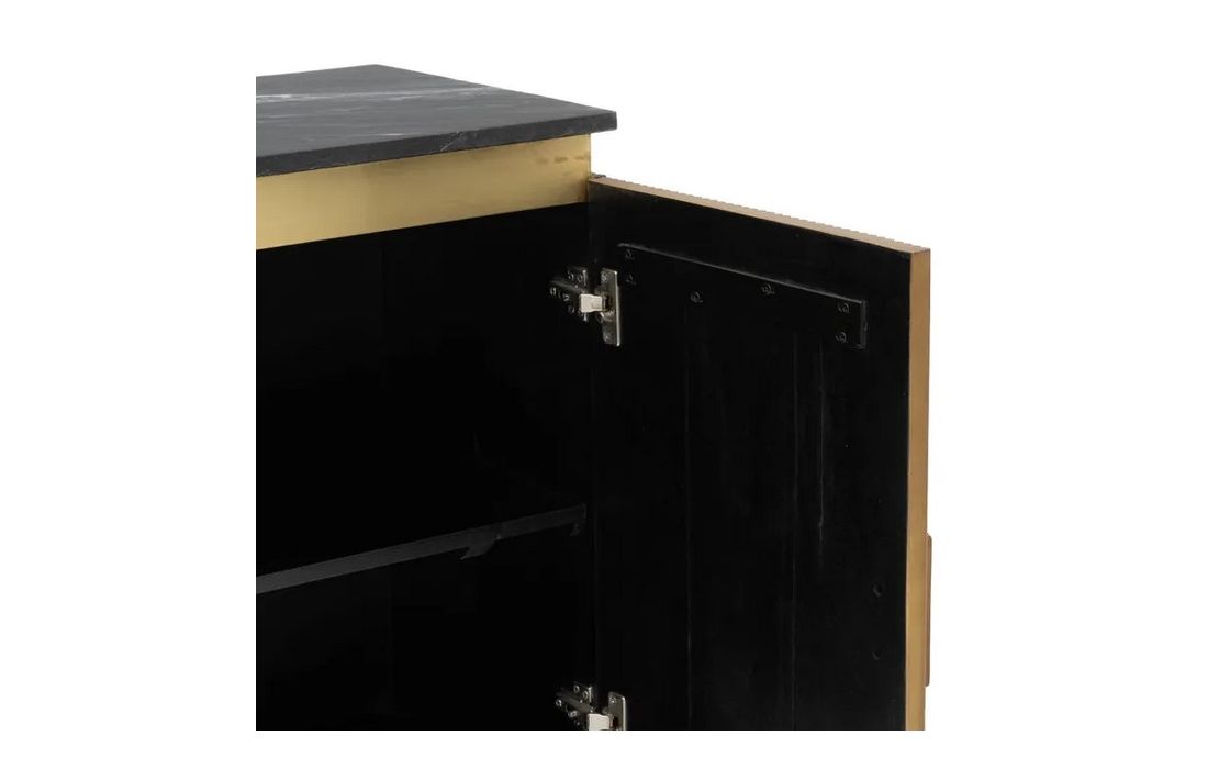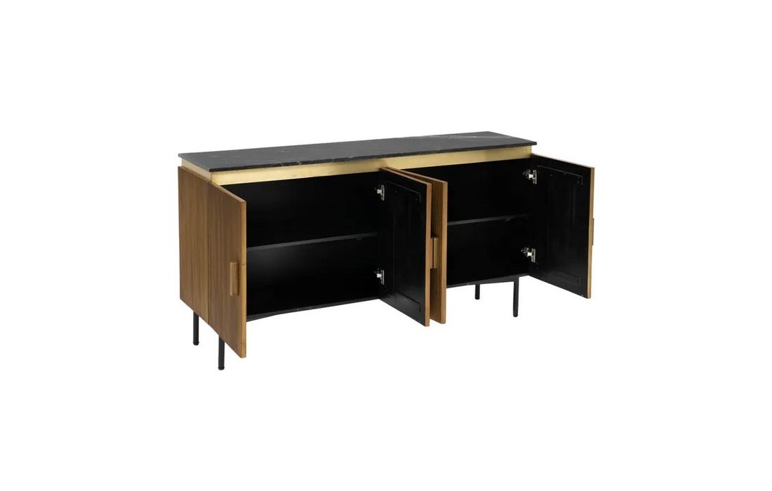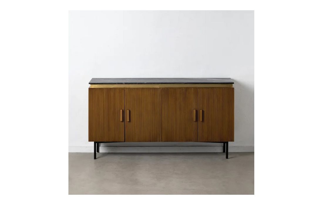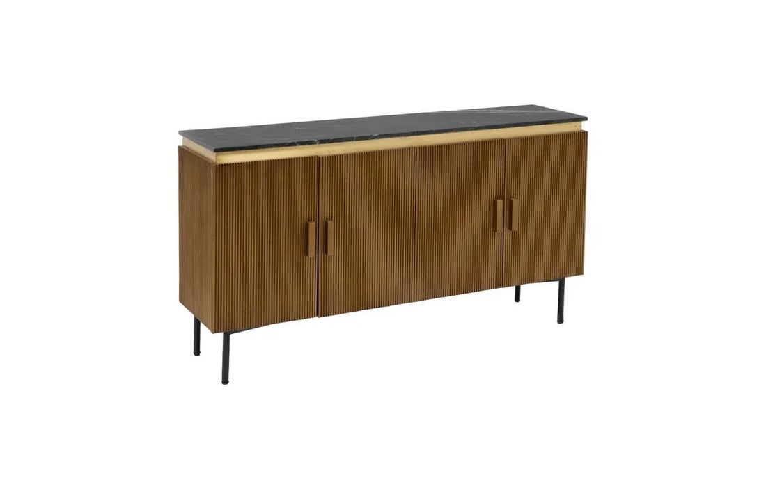 Brown mango wood sideboard with marble top, 4 doors and metal feet