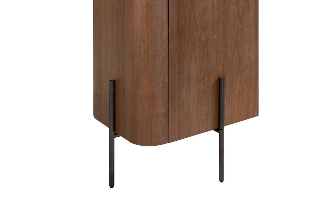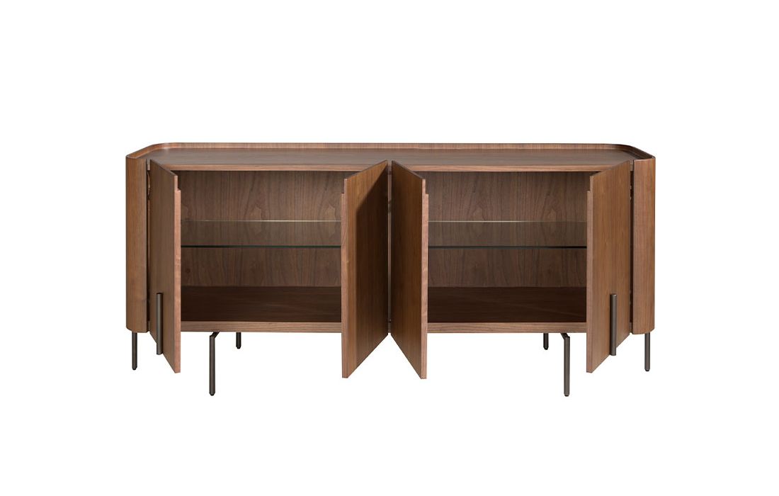 Walnut veneered sideboard with four tempered glass doors and internal shelves and black stainless steel leg frame