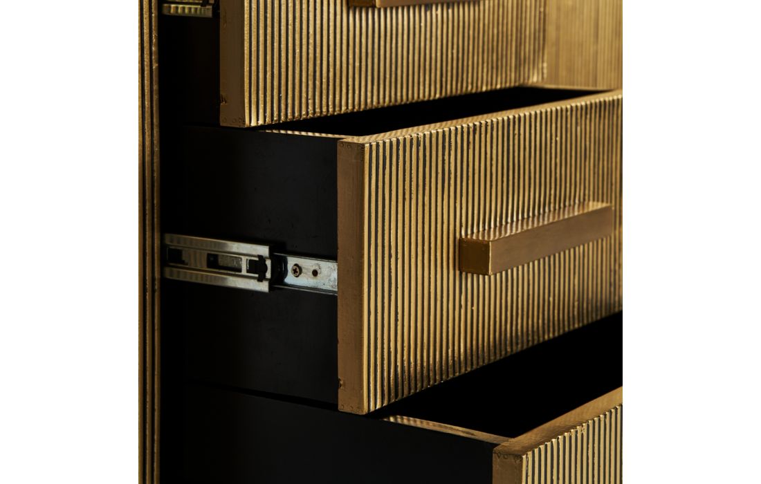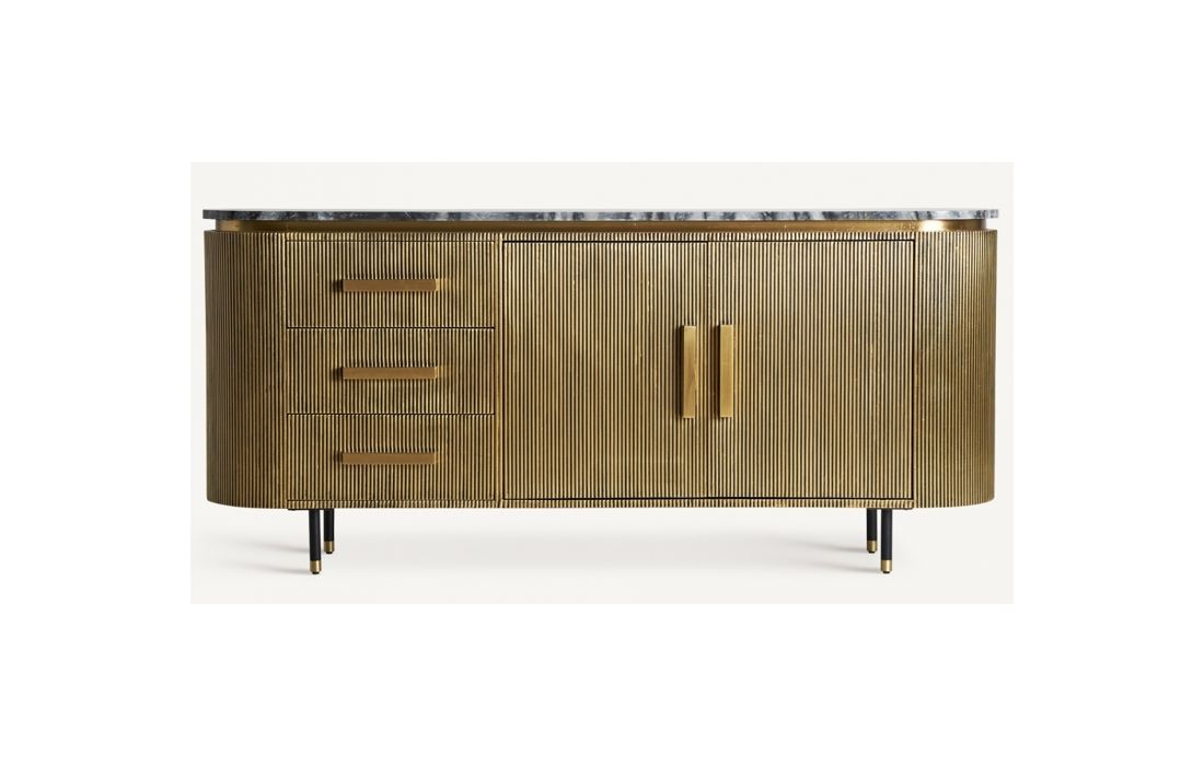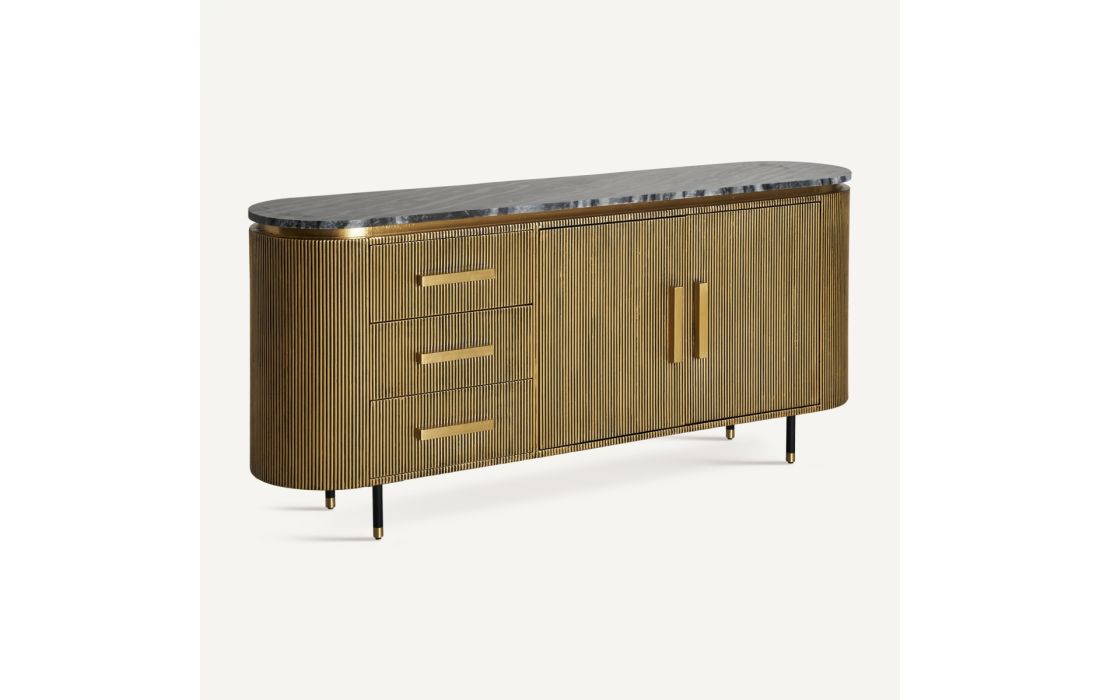Sideboard with 2 doors and 3 drawers, made of gilded iron with an aged style, with marble top.