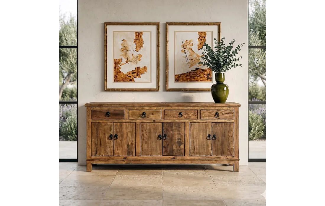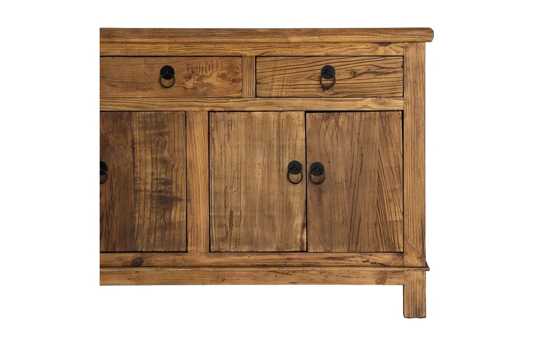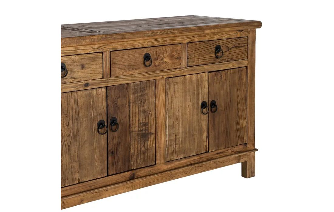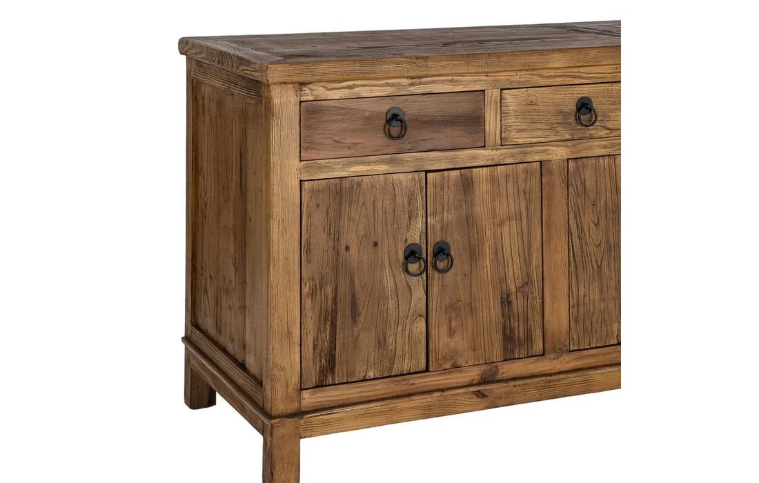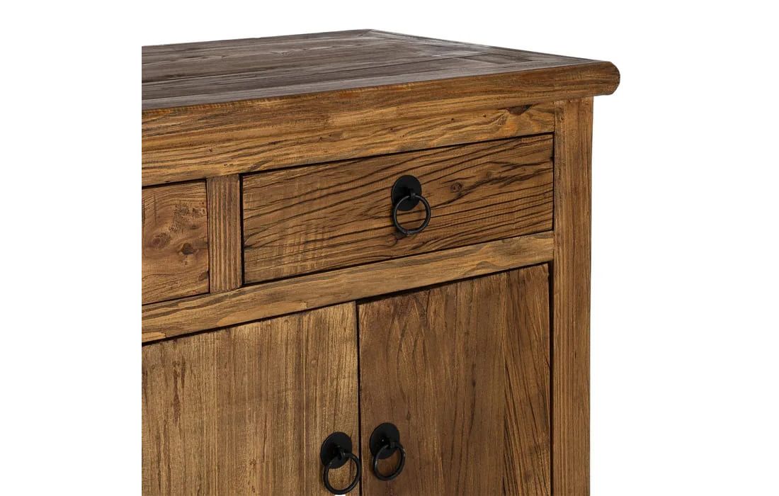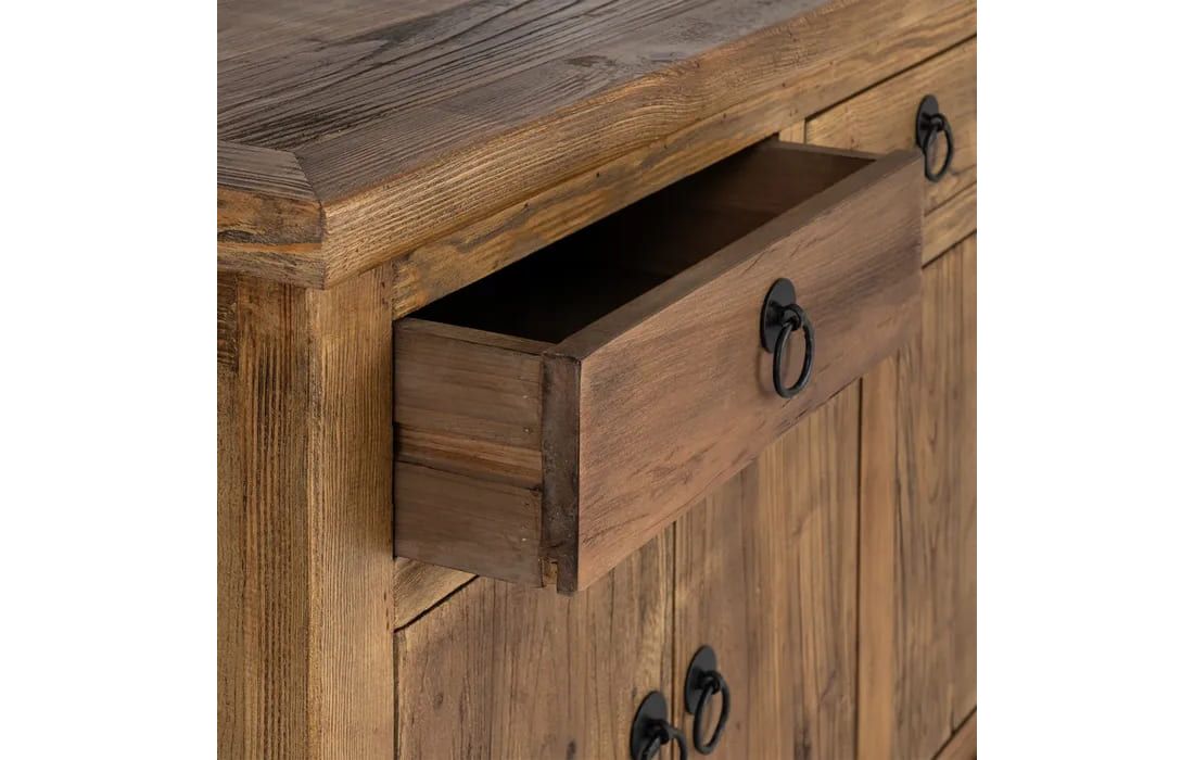 Sideboard made from recycled pine wood, with doors and drawers that ensure excellent storage. Its classic style combined with its sustainable character highlights the natural markings of the wood, making each piece unique. Ideal for cozy environments with a rustic and authentic touch.Recipient :