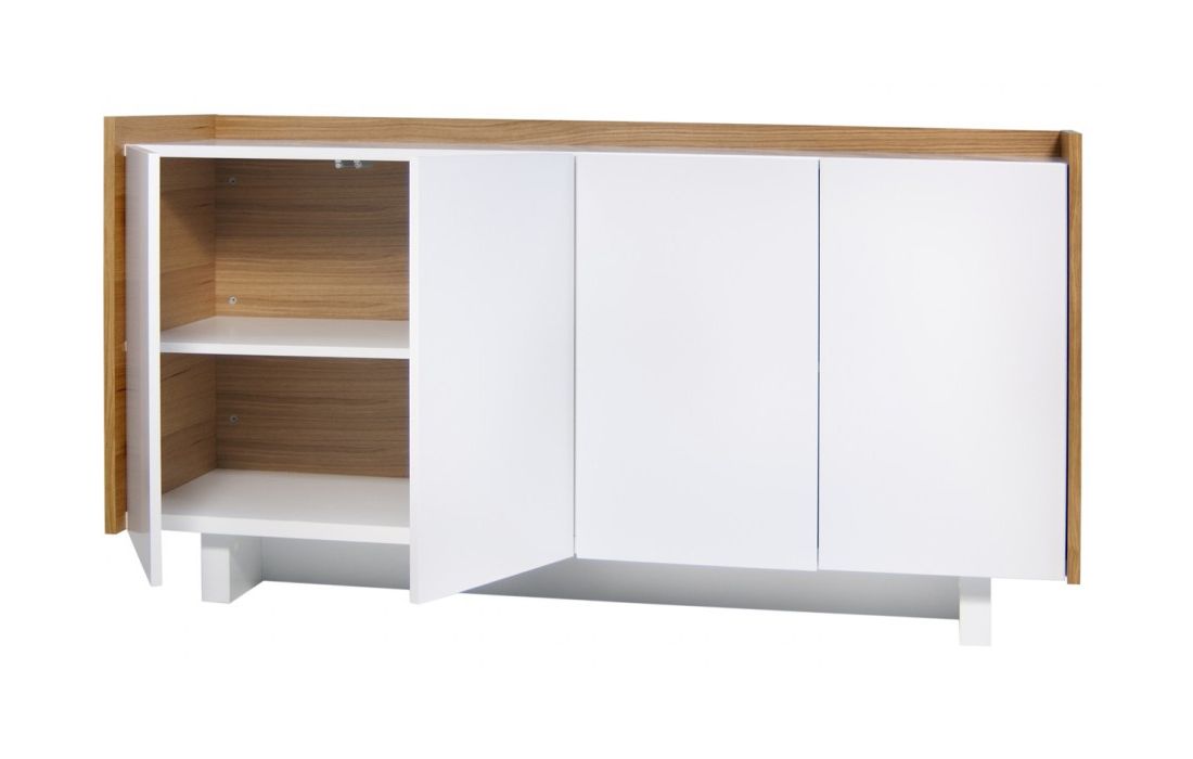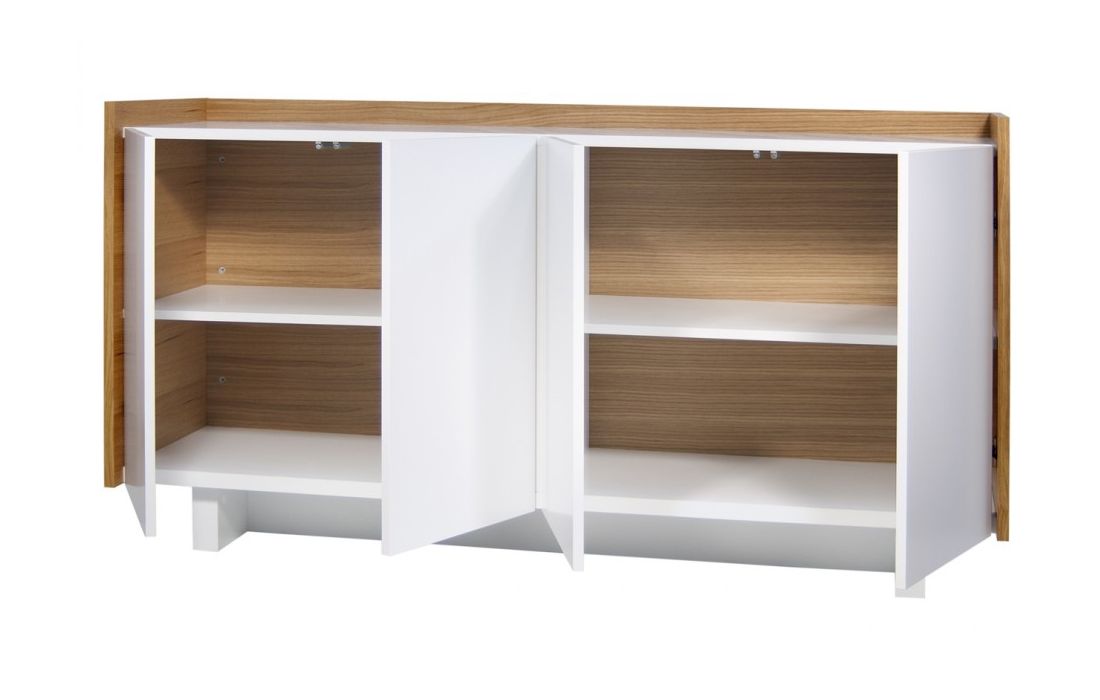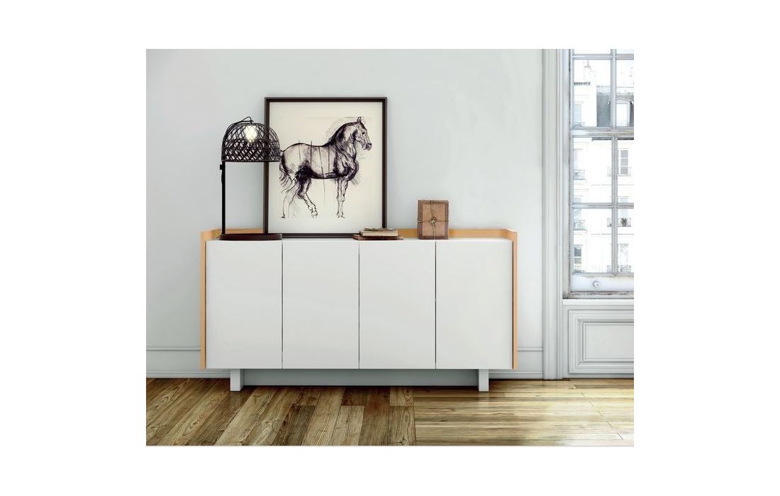 Niks sideboard stands for simplicity and pure functionality. The immaculate white is broken by the thin width wood veneer which surrounds the piece on its outside, and covers the whole piece inside. With four doors and lots of storage space, all that is seen are the marvelous lines of this amazing piece suited for living, dinner rooms or even kitchens.