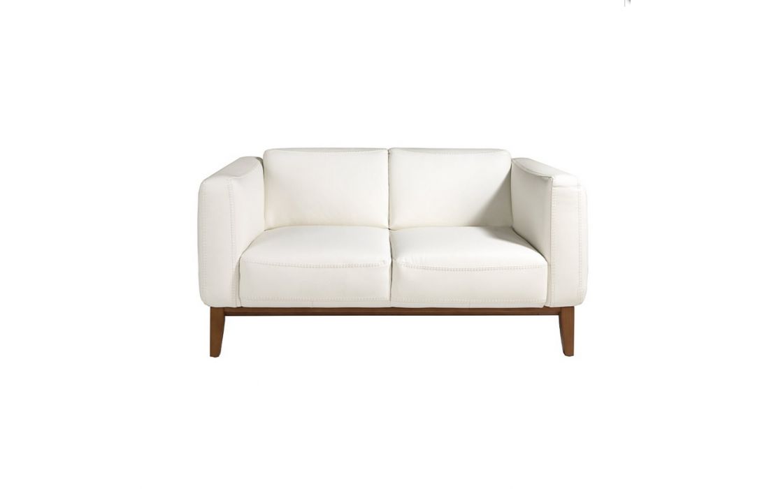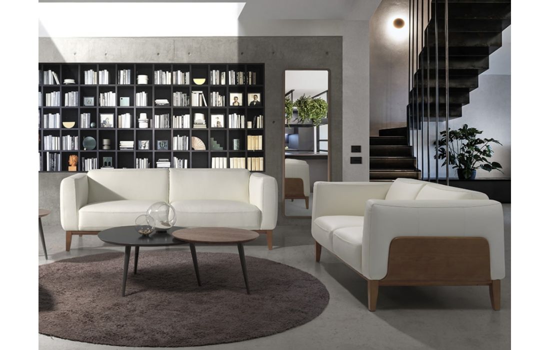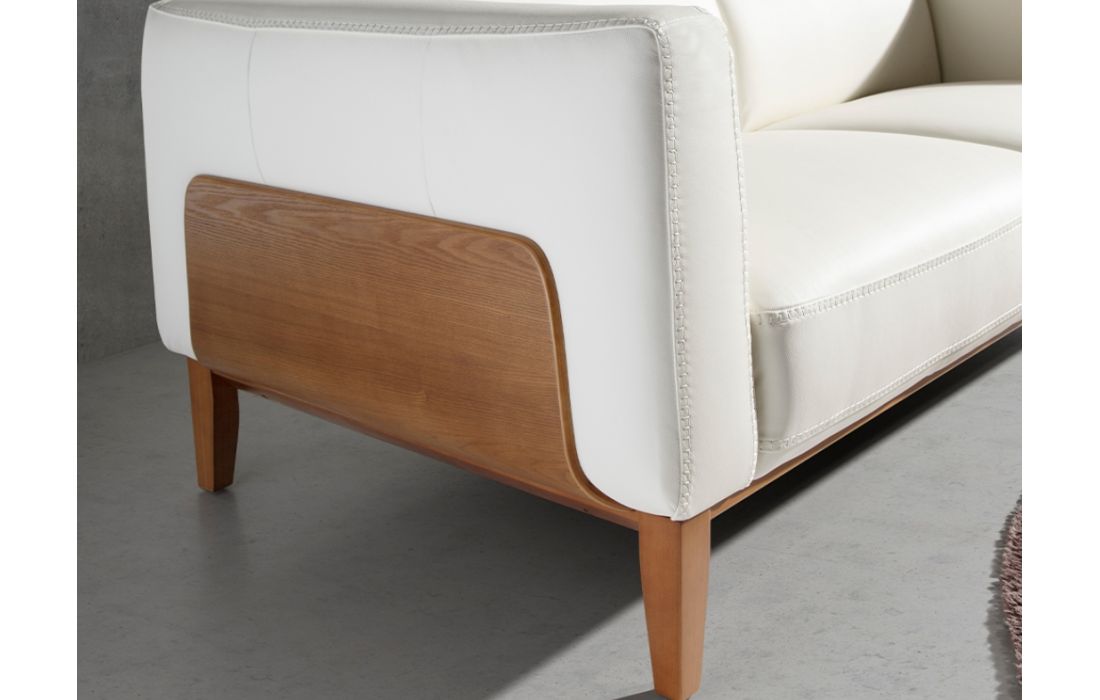 Modern design sofa upholstered in cowhide with walnut-colored oak wood finish and wooden legs in the same colorRecipient :