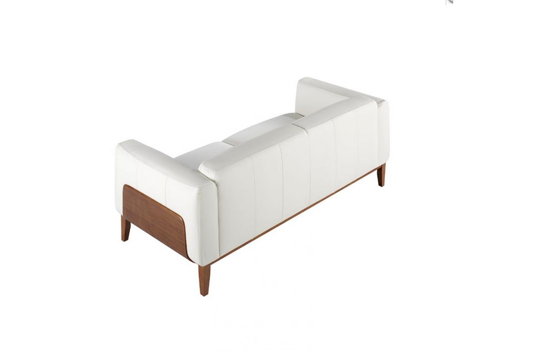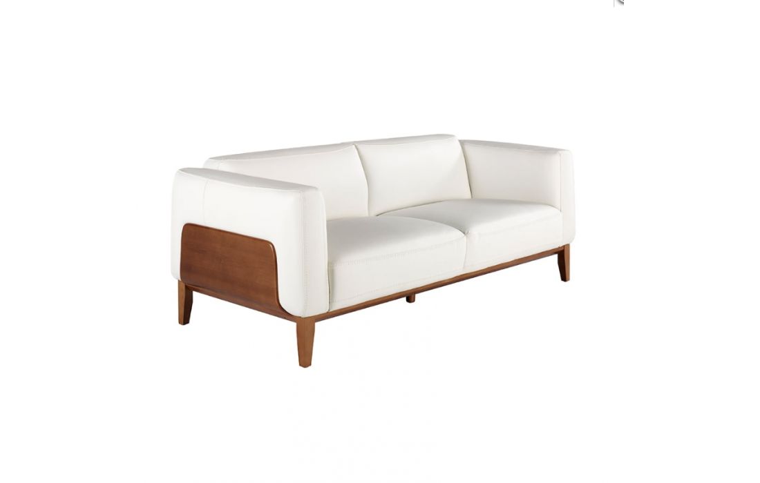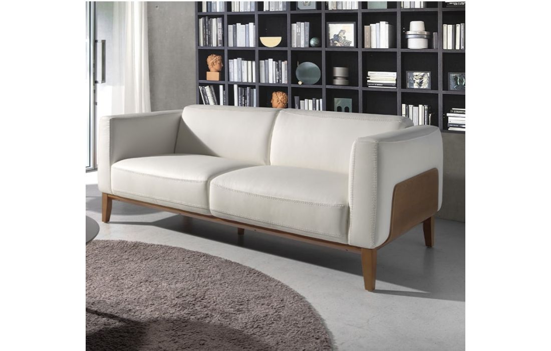Modern design sofa upholstered in cowhide with walnut-colored oak wood finish and wooden legs in the same colorRecipient :