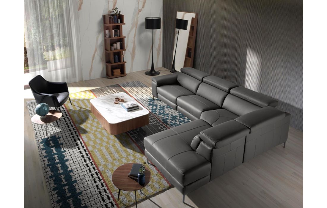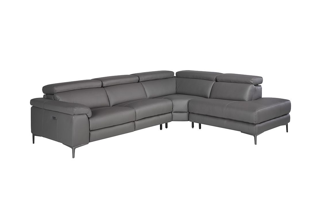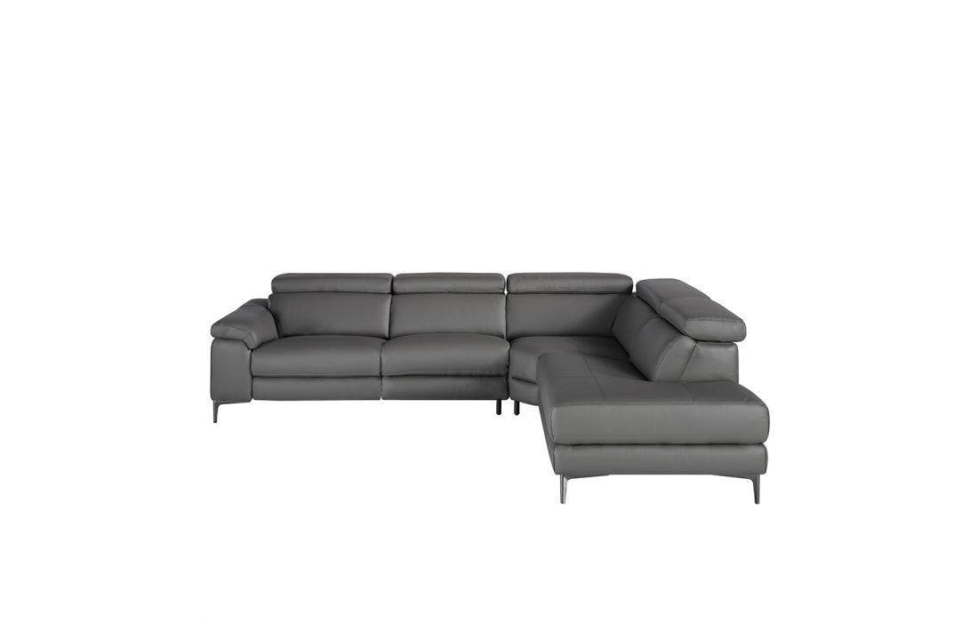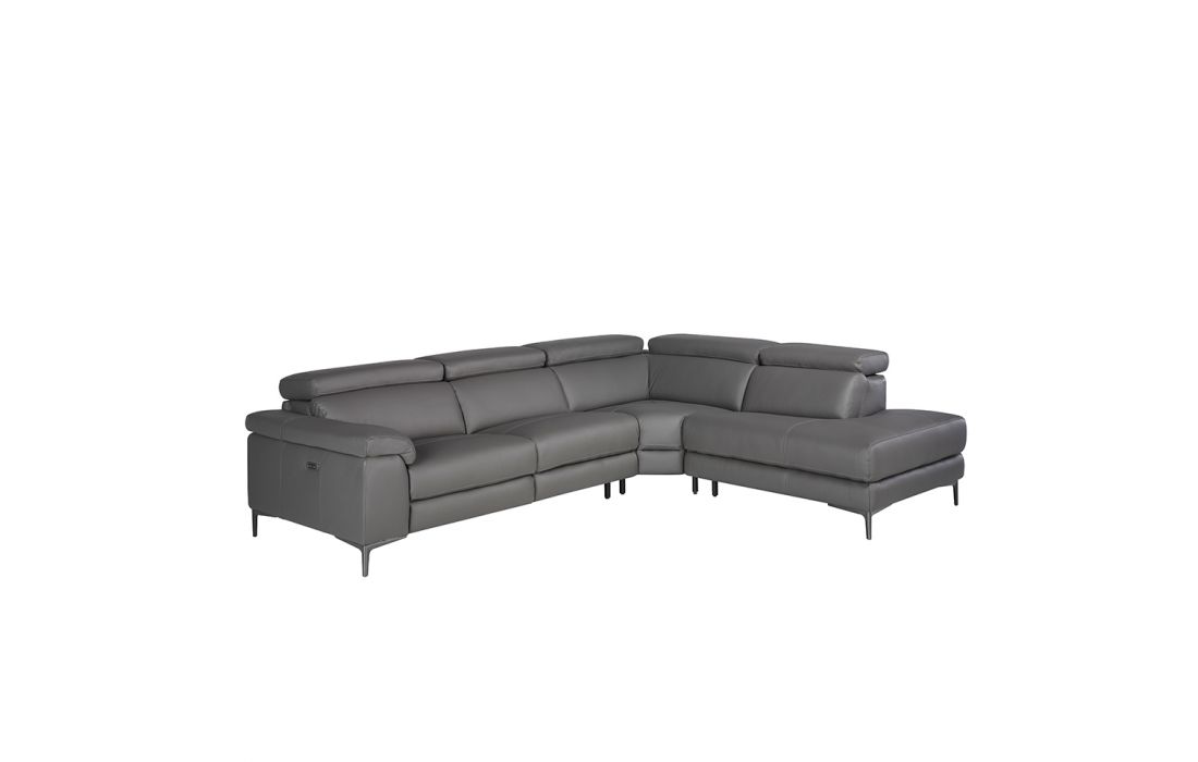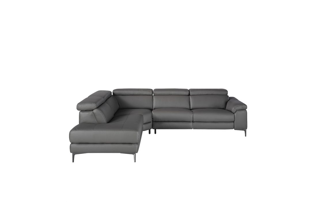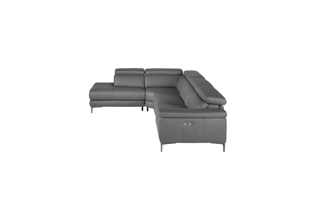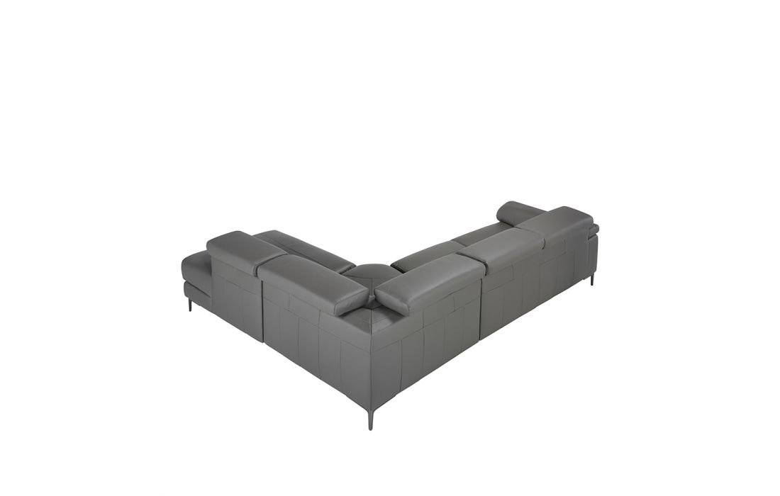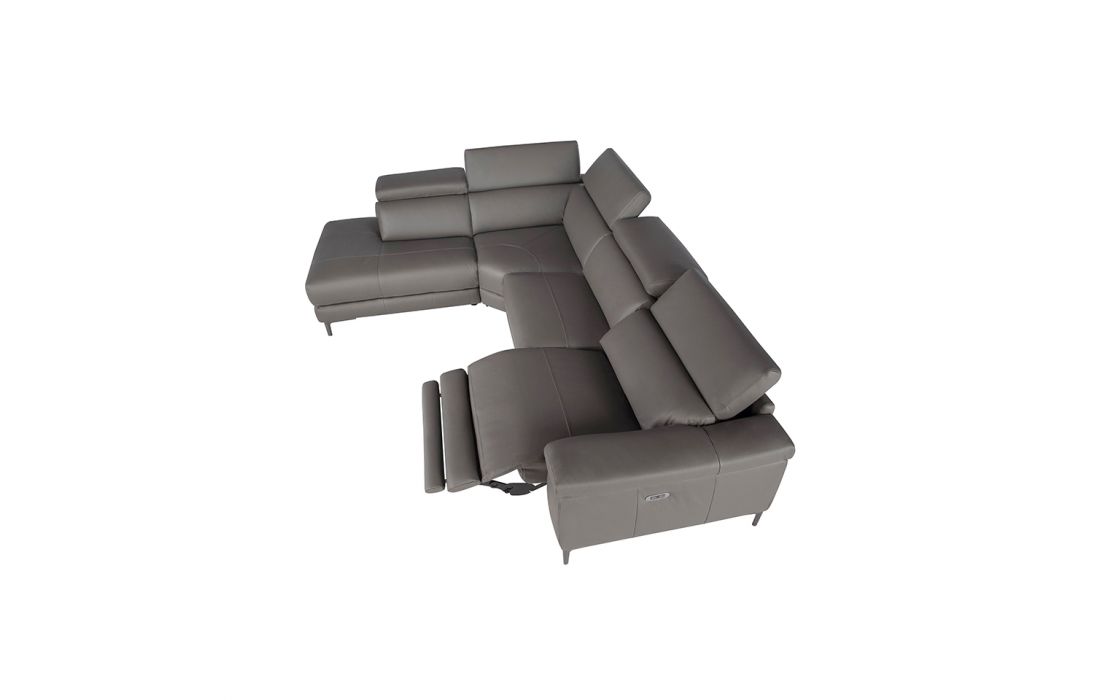 Corner sofa upholstered in gray cowhide leather with black epoxy steel legs and independently adjustable headrests. Side seat with electric relaxation mechanism.