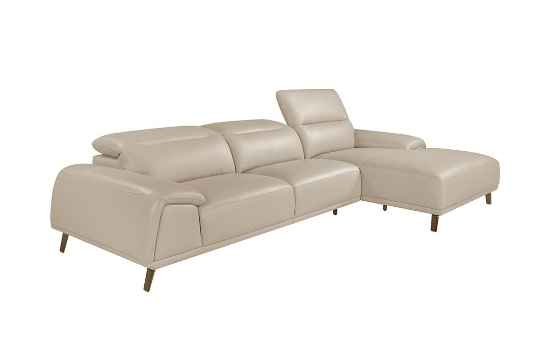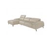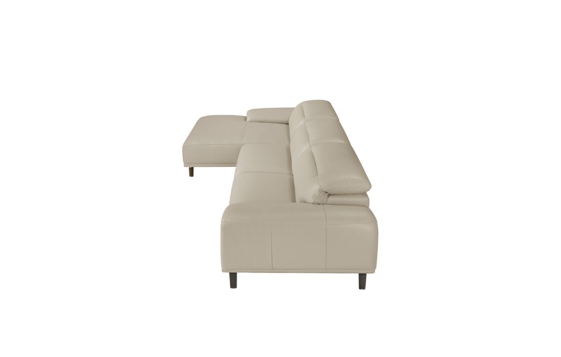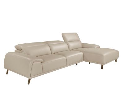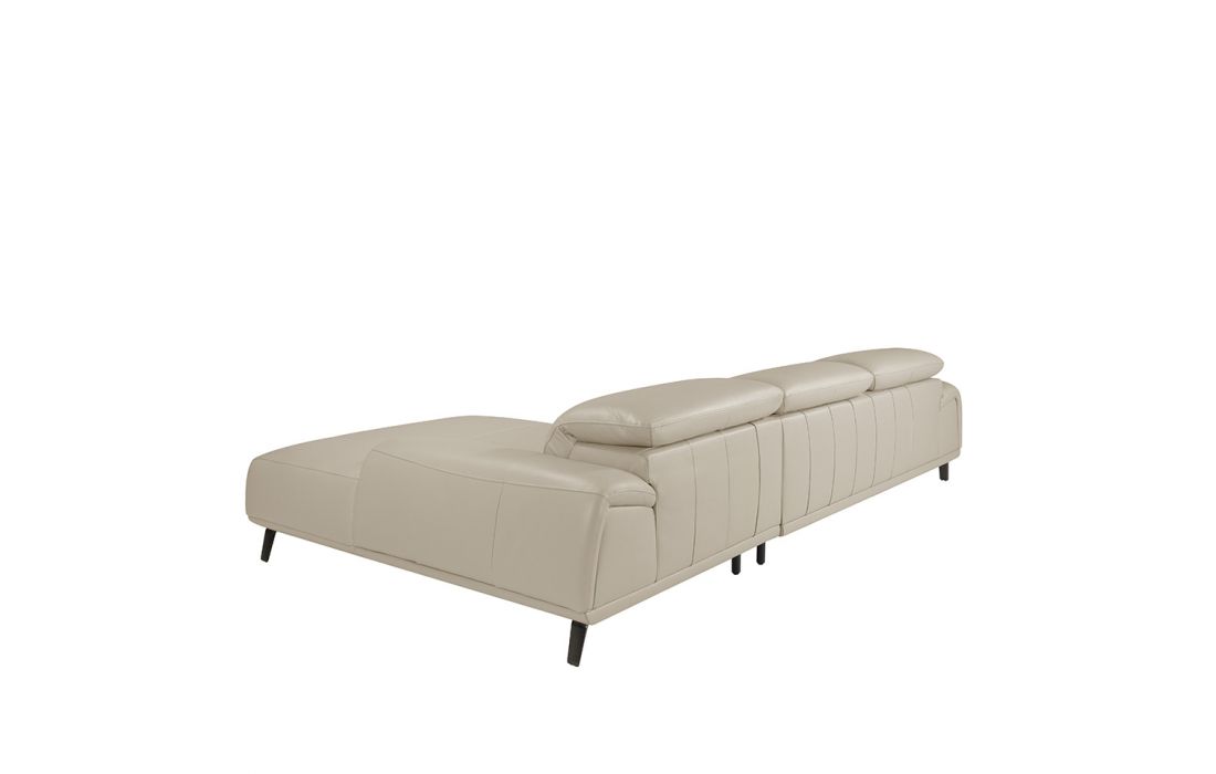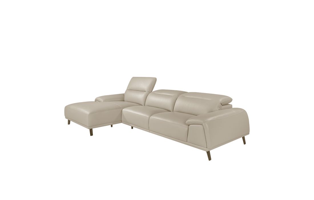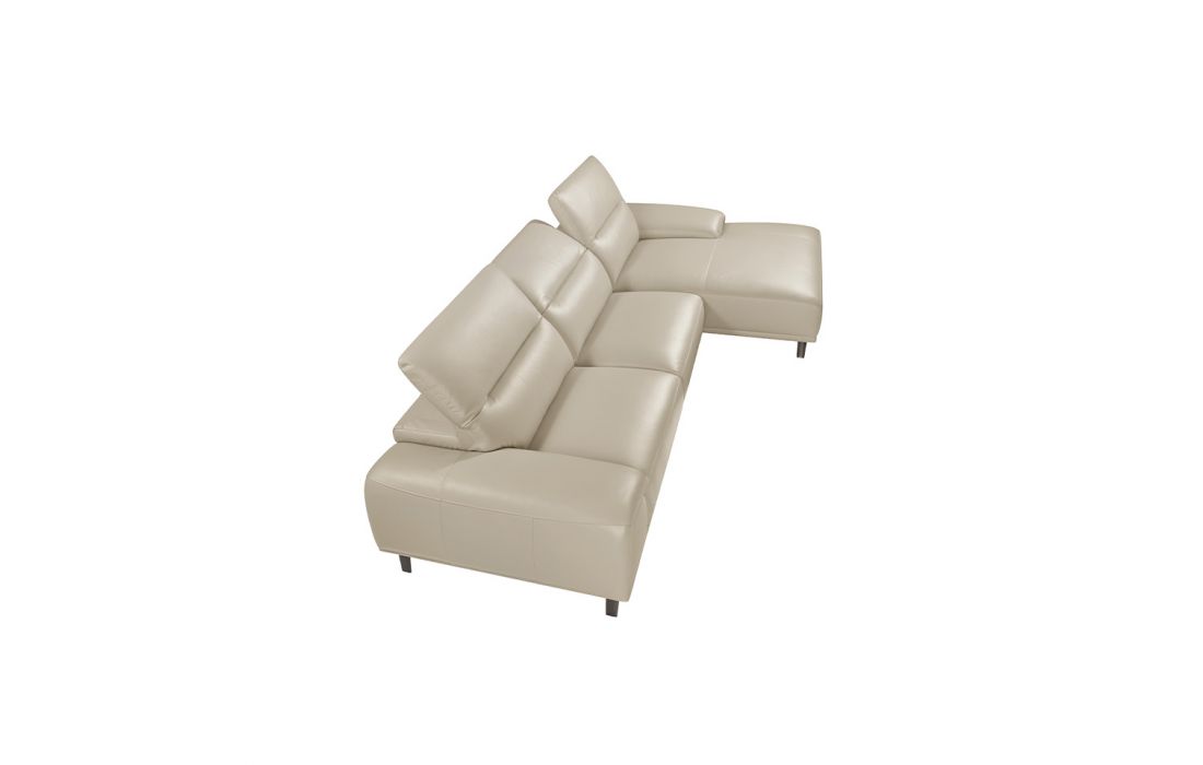 Sofa with chaiselong upholstered in taupe cowhide leather. Independent articulated headrests. Internal structure in pine wood with polished solid steel feet.