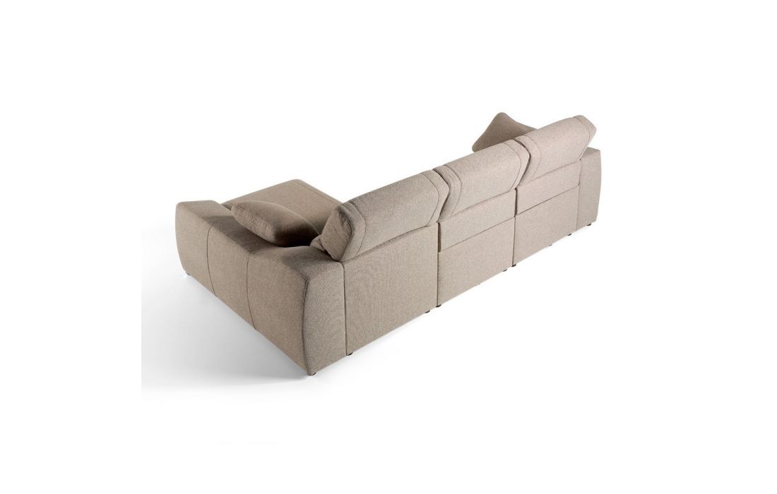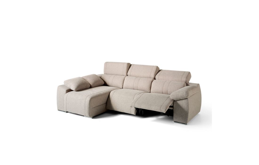Chaise lounge sofa upholstered. Foldable headrests with different positions. 2 x seats with reclining electric relaxation mechanisms. Chaise lounge with folding storage box mechanism. Armrest with storage box.