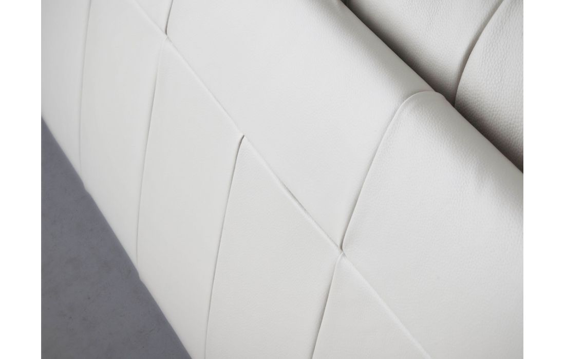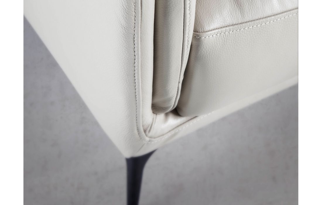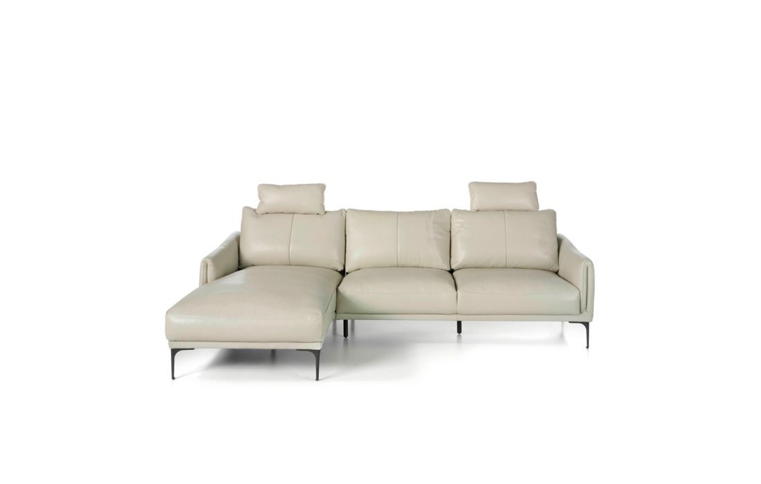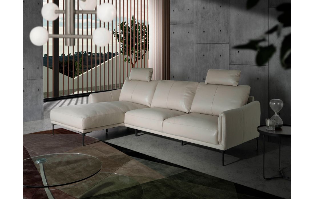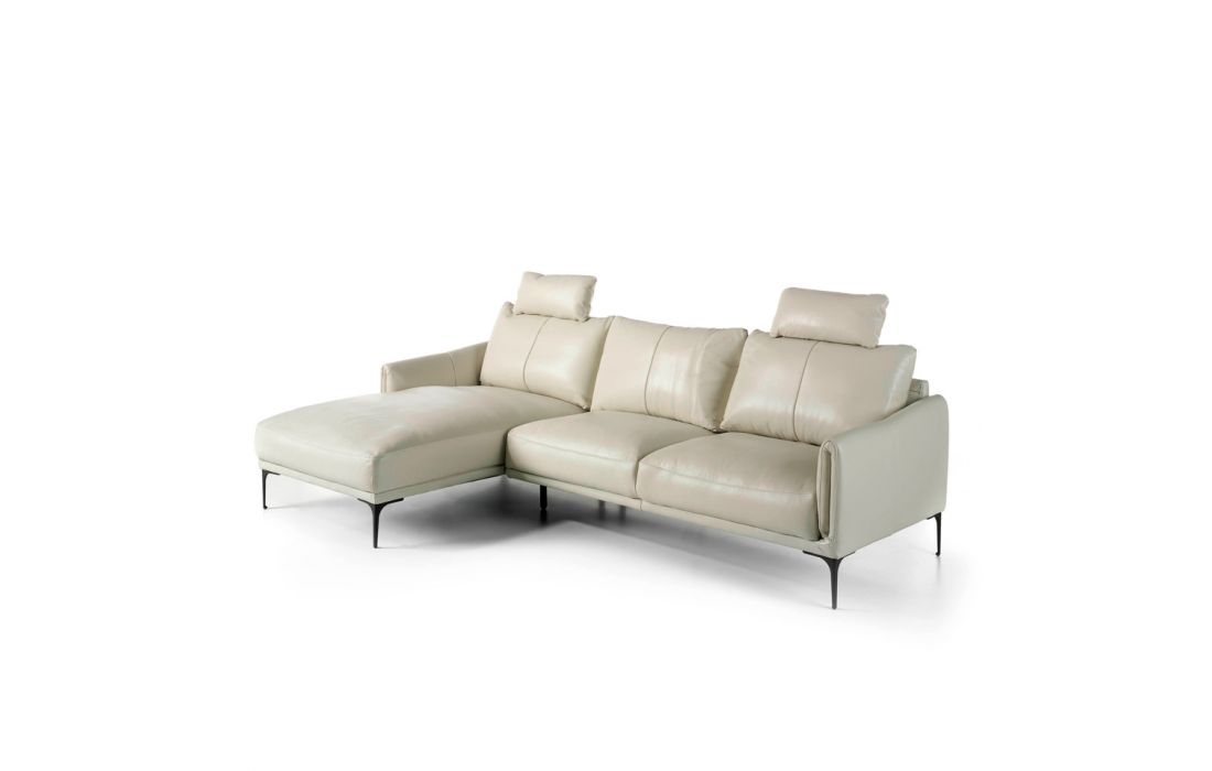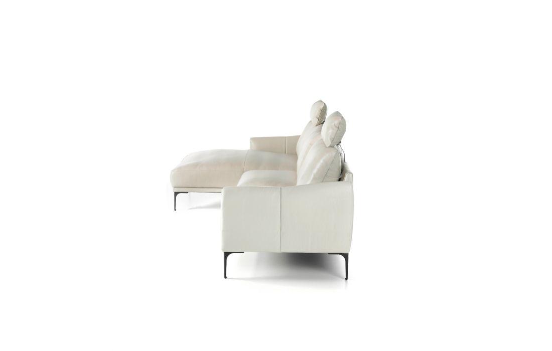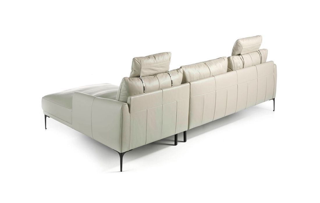 Chaiselong leather upholstered sofa with removable headrests and black-painted steel feets.