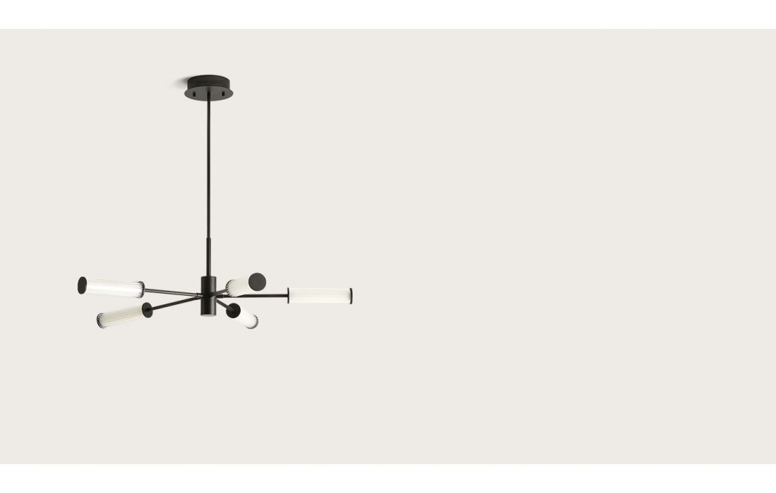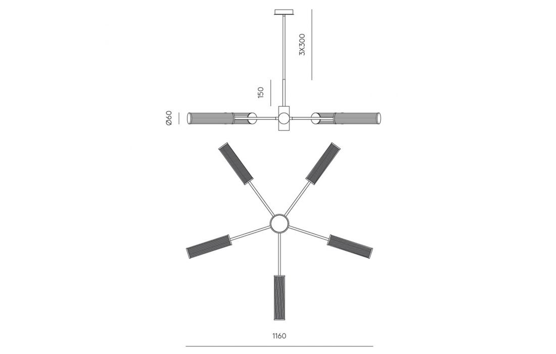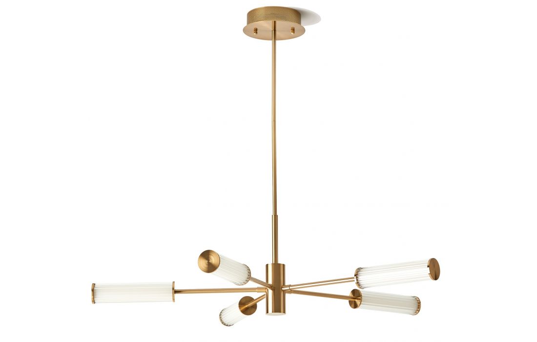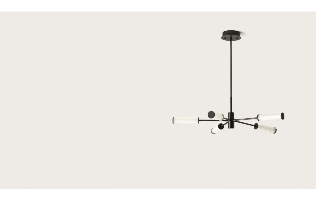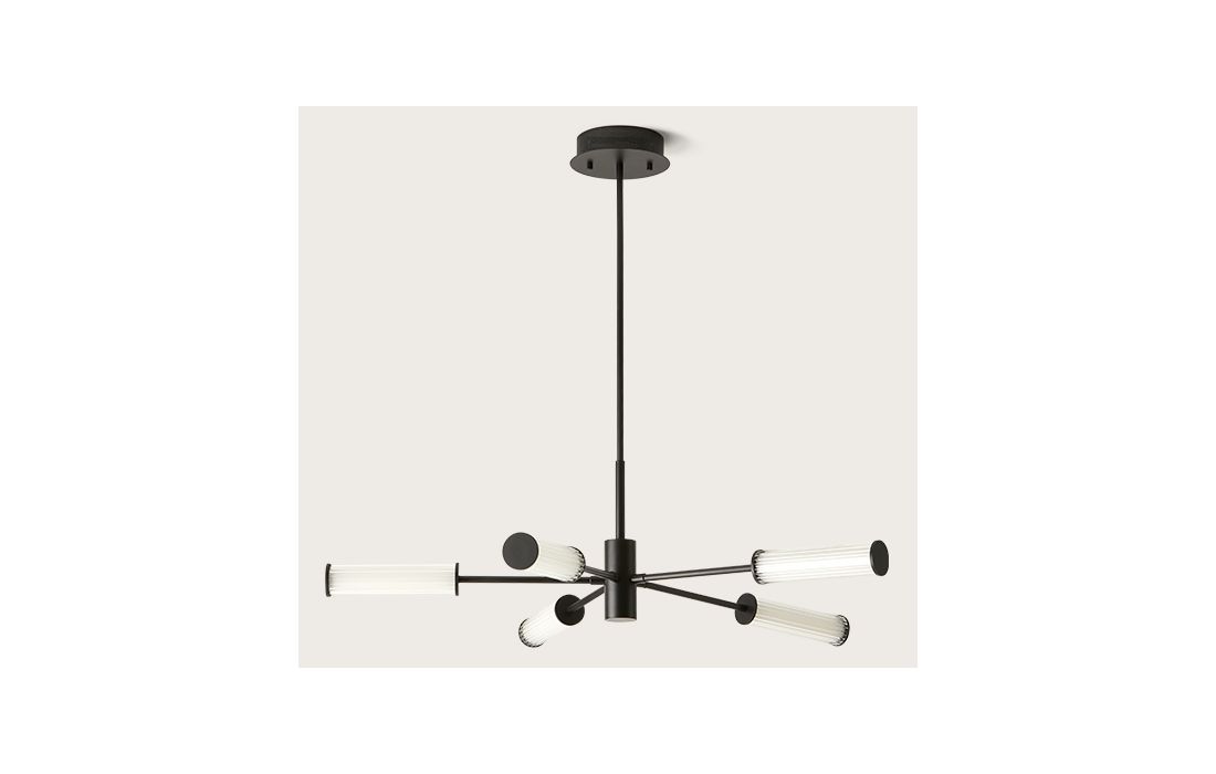 Ceiling lamp in metal available in black or aged gold, with 5 lampshades in transparent fluted glass.