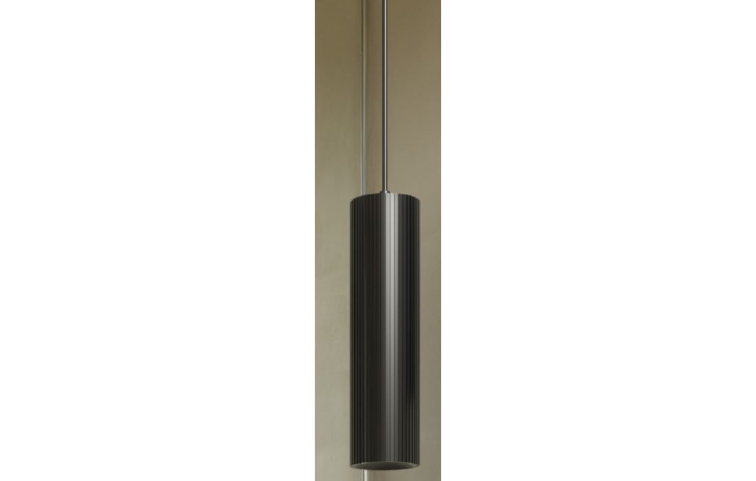 Pendant lamp ideal for providing lighting on specific surfaces such as worktops, counters and tables. The lampshade is made of cylindrical metal with a light point at the bottom. Available in matte black and aged gold..