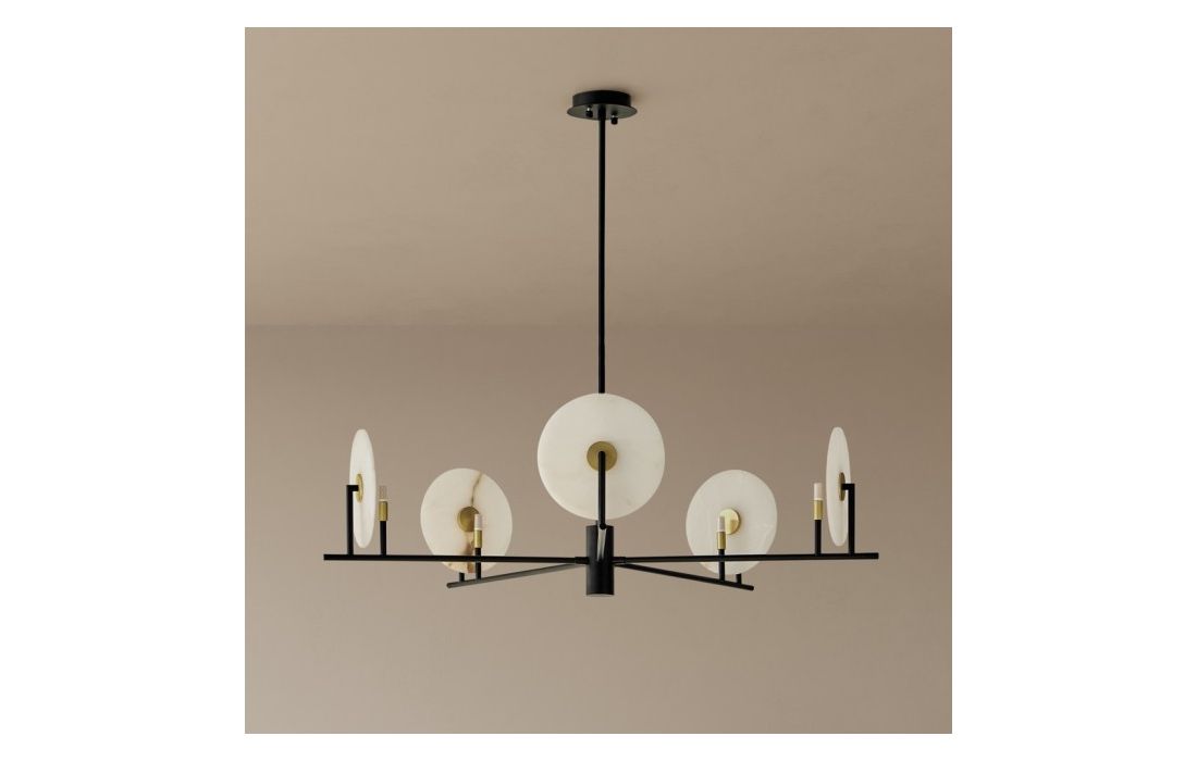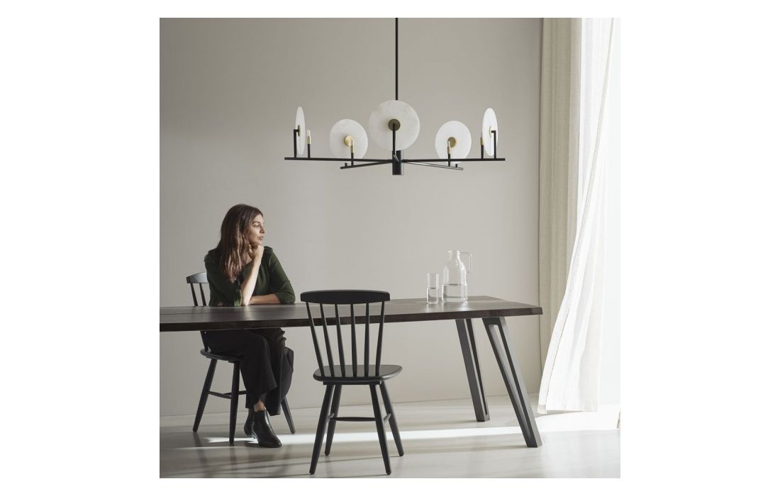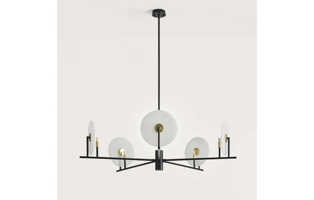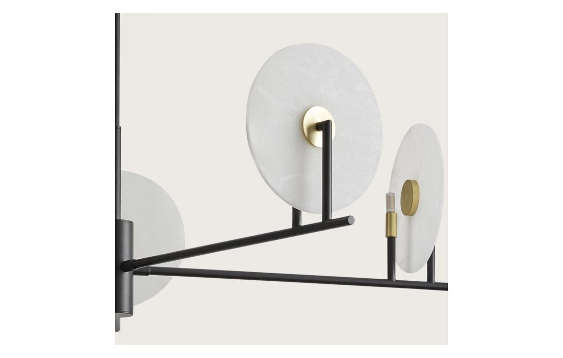 This lamp will fulfill the mission of providing ambient light to your space. The first thing that catches the eye is the circular lampshade made of ceramic, located on a matte black metal structure with golden details. The Ceiling Lamp is characterized by its steel and ceramic structure.