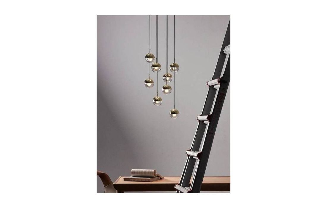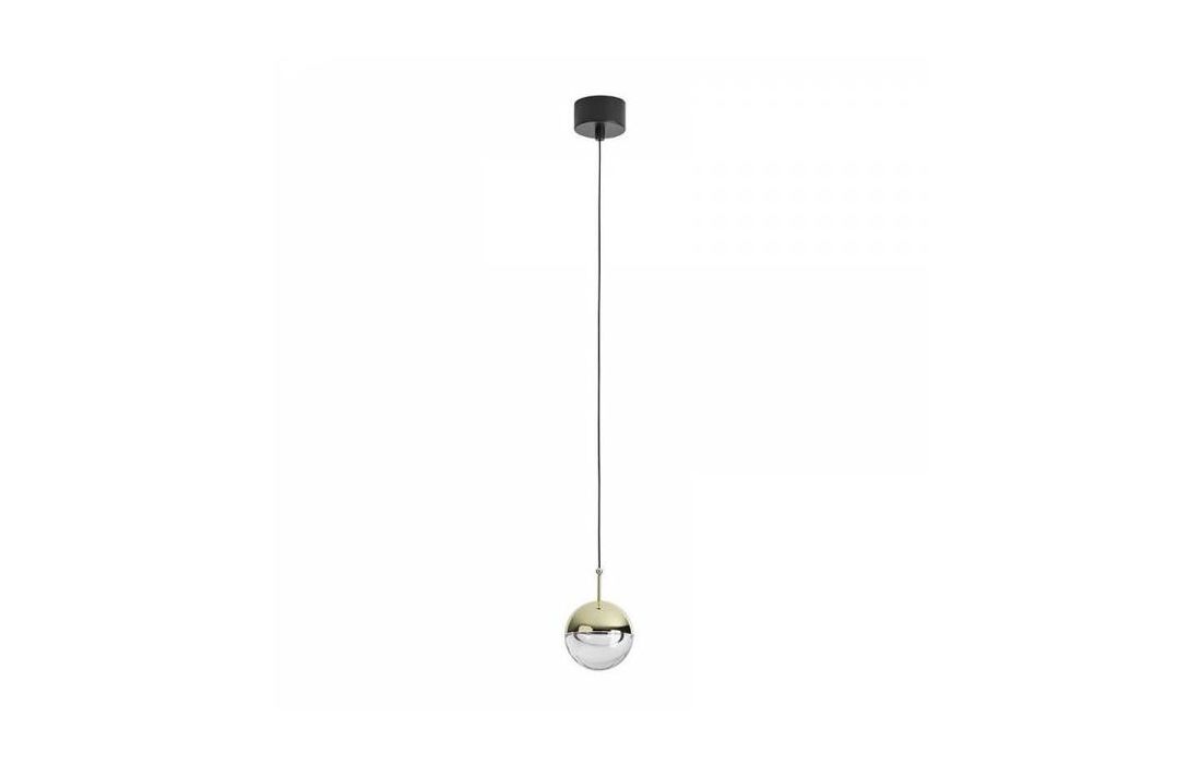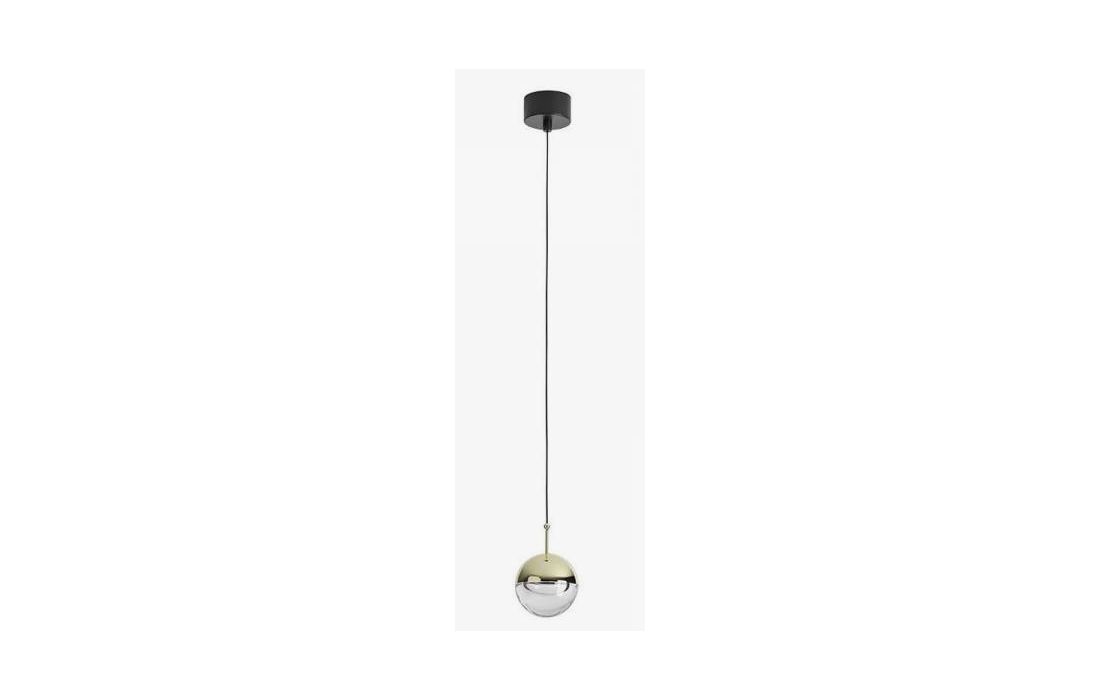 Pendant lamp with a sphere divided by 2 materials that contrast perfectly. The top part is made of shiny gold-plated steel and the bottom part is made of optical glass. This combination creates an atmosphere effect and an elegant and sophisticated light effect.