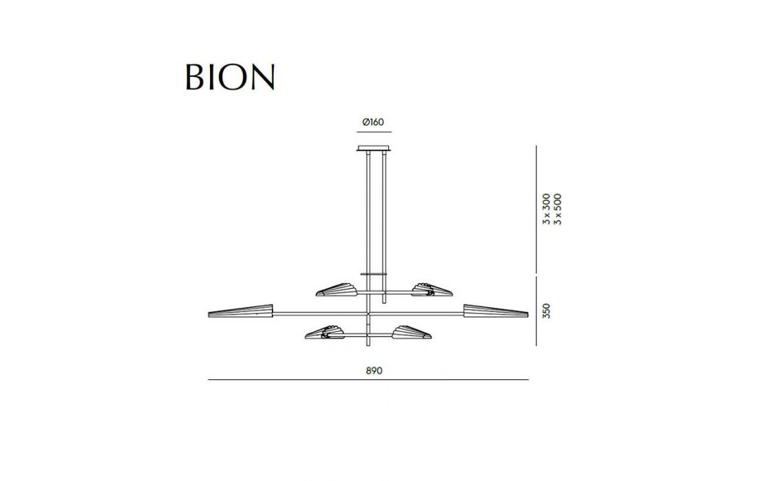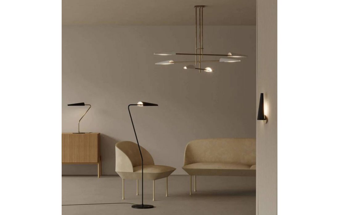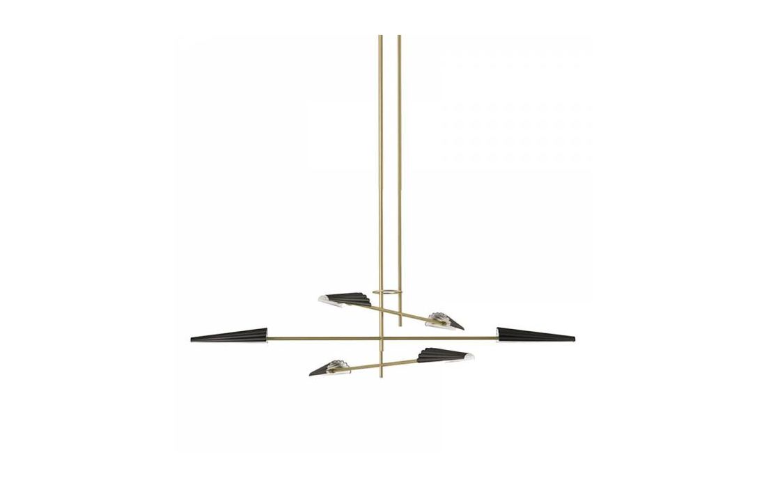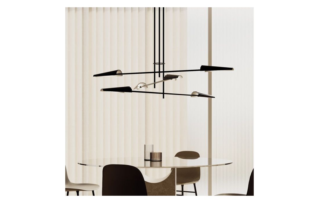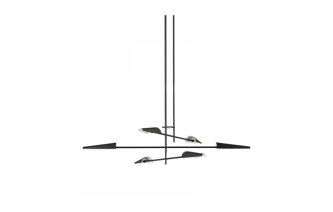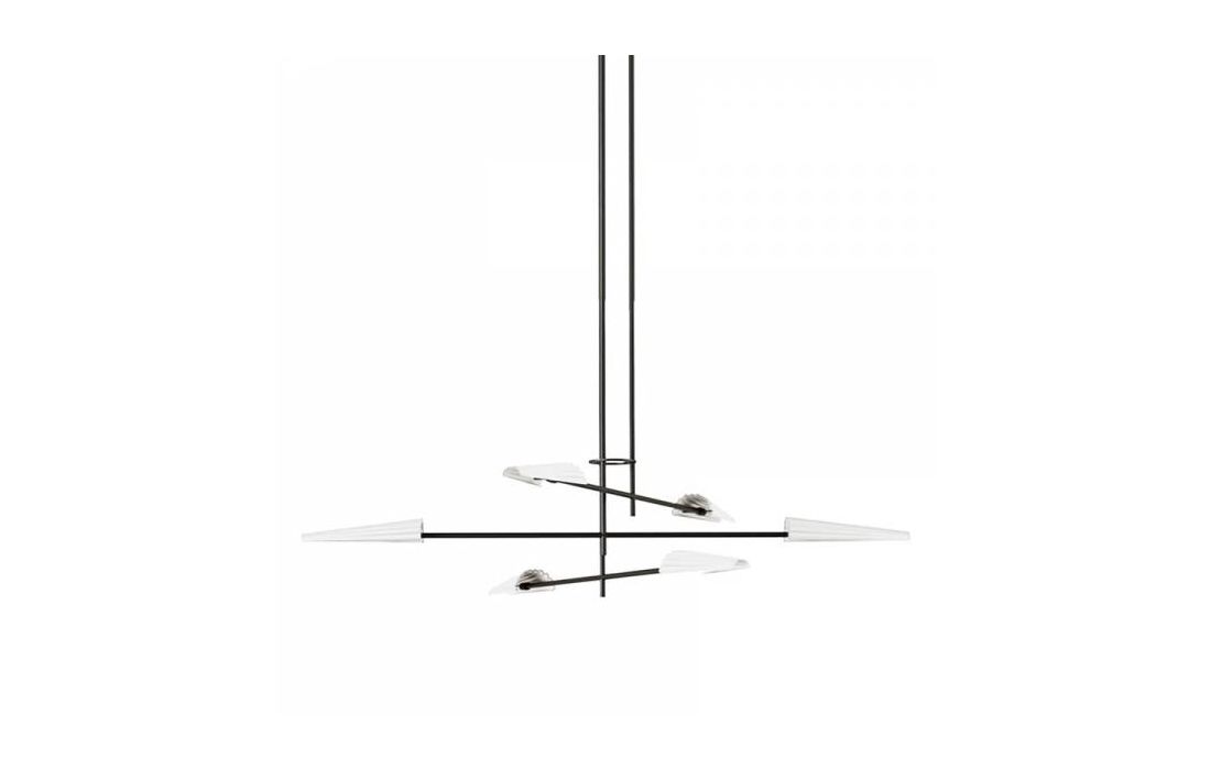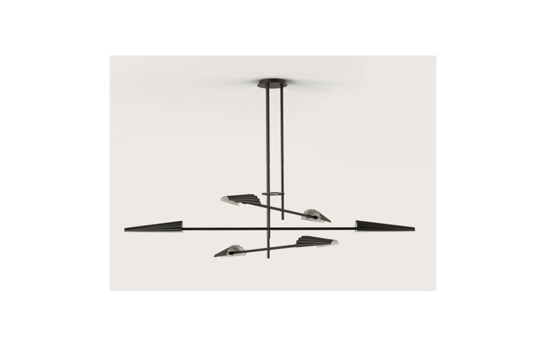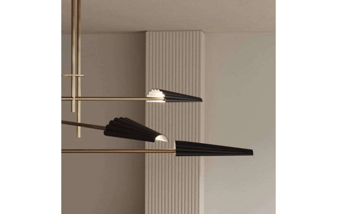 Large format pendant lamp designed to efficiently illuminate large spaces such as living rooms, stairs or dining tables with a central structure made up of three metal bars whose arms end in an original corrugated metal lampshade.