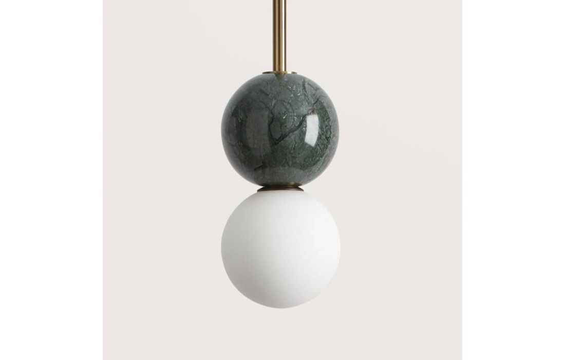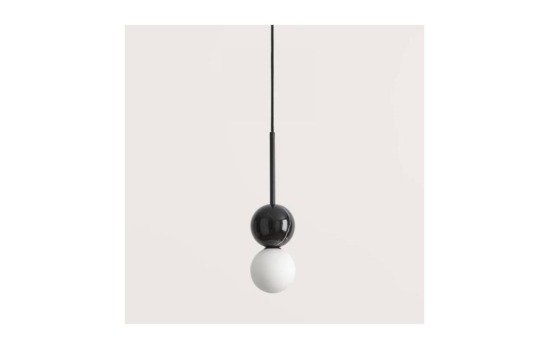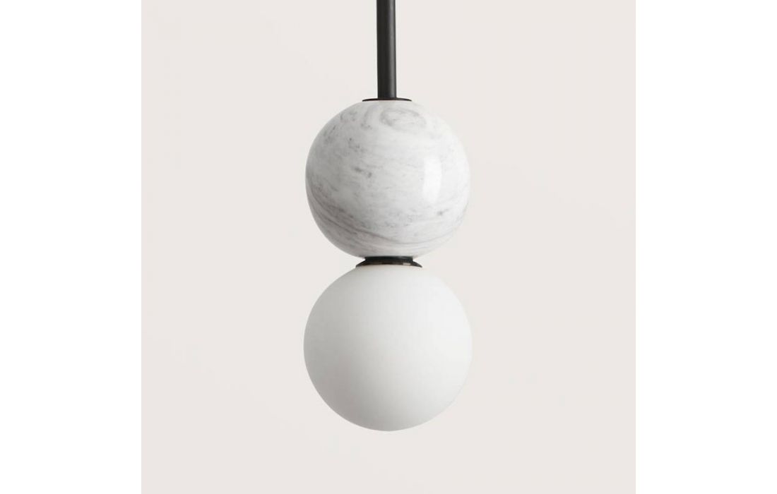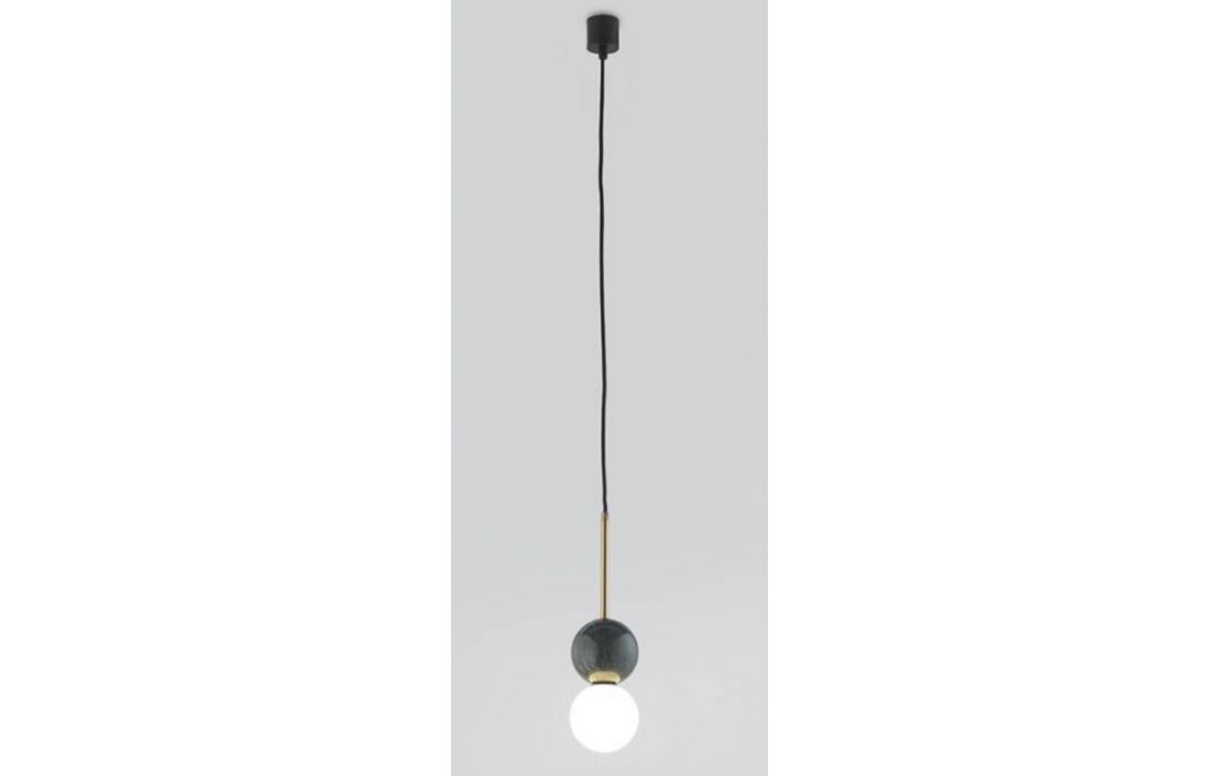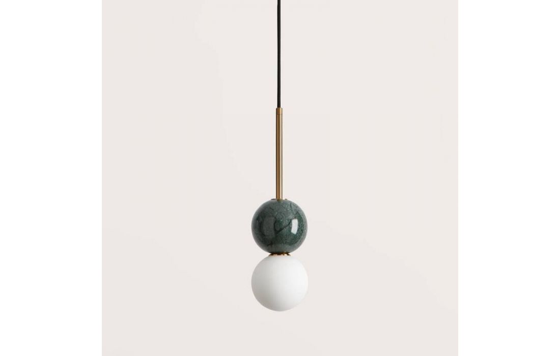 The Dalt pendant lamp is a sophisticated combination of materials and shapes that come together with a design that evokes times gone by, with an upper sphere in opal glass and a lower sphere in white, black or green marble. Base in black metal or aged gold (depending on the color of the chosen marble).